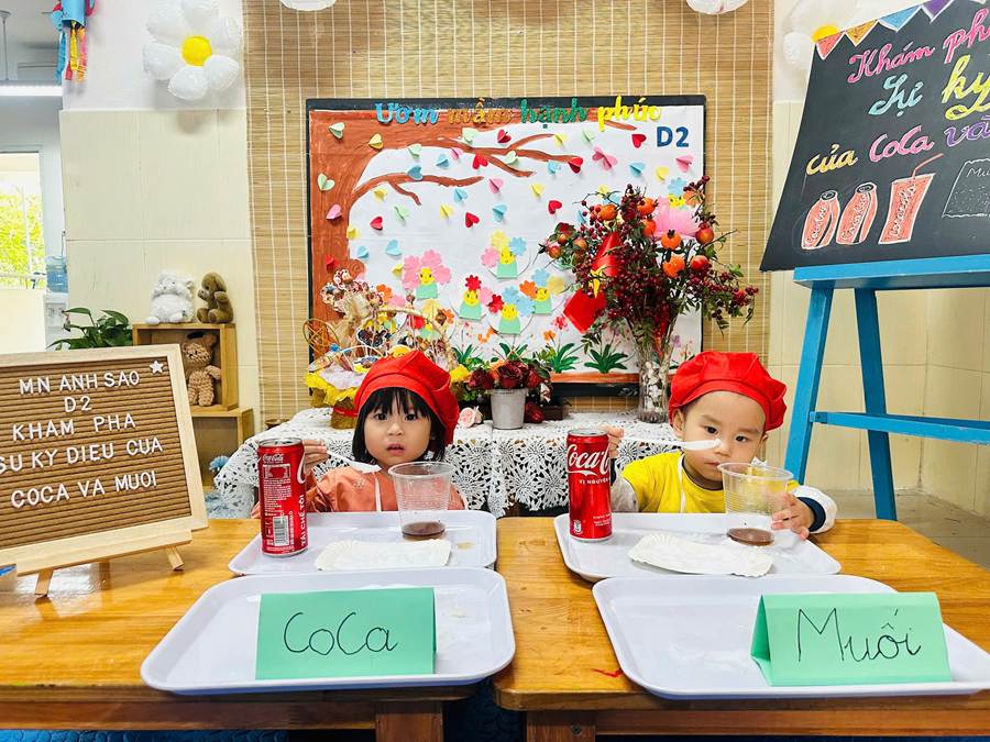 Nhằm khơi gợi sự tò mò và hứng thú khám phá khoa học ở trẻ nhỏ, các bé lớp Nhà trẻ D2 – Trường Mầm non Ánh Sao đã được tham gia hoạt động khám phá với chủ đề “Sự kỳ diệu của Coca và muối”.