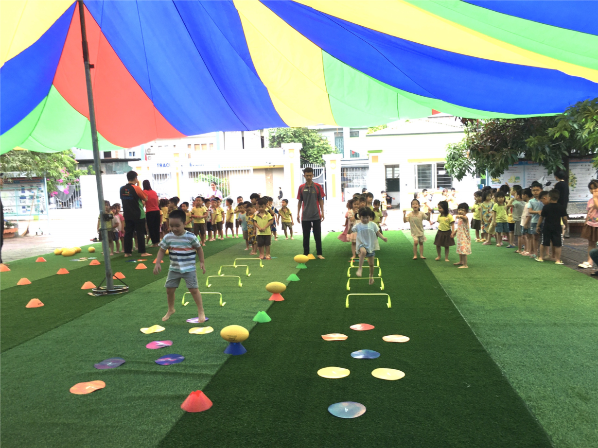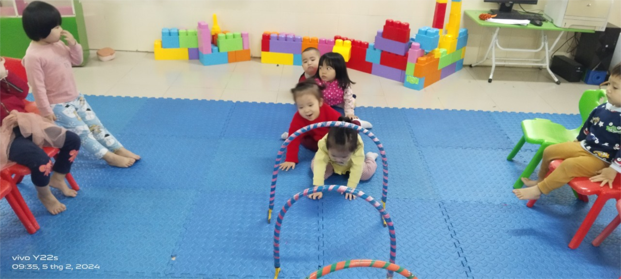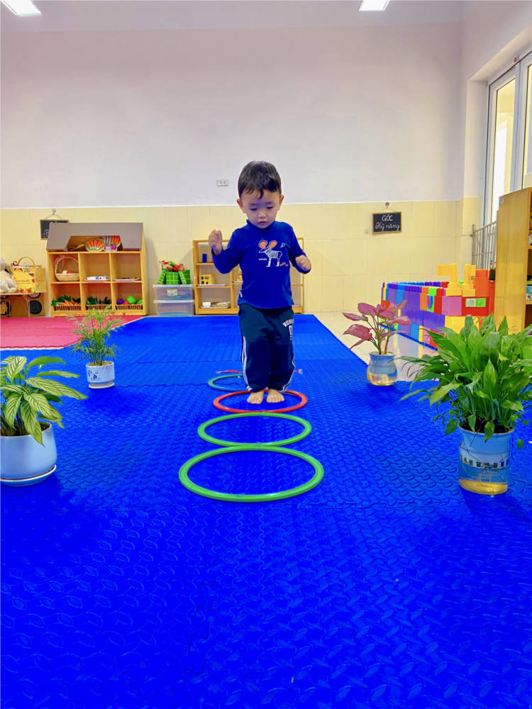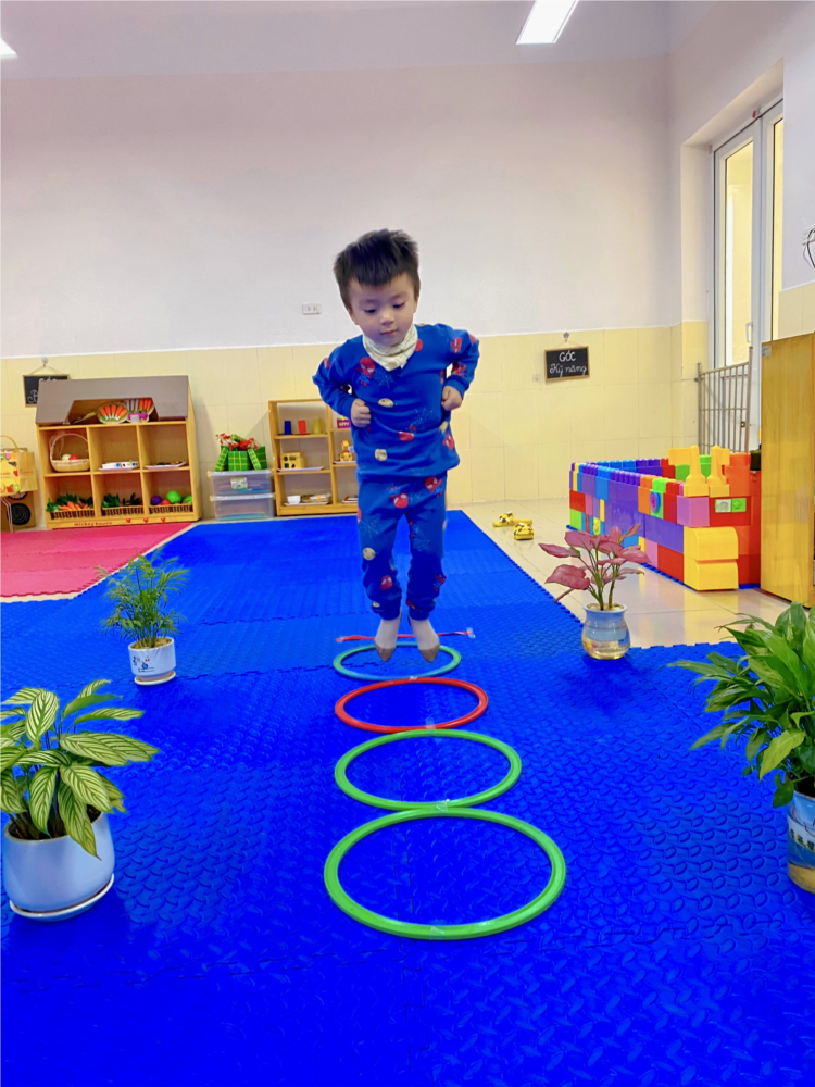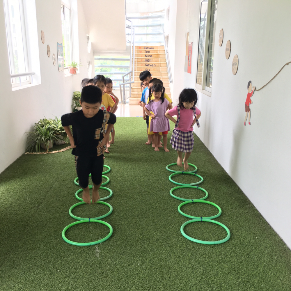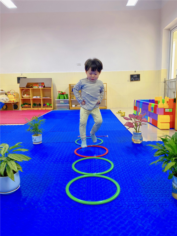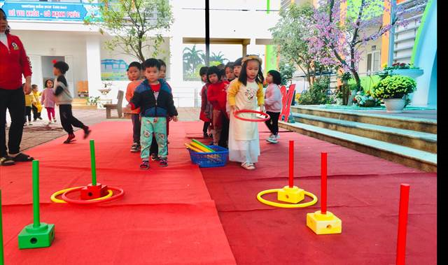 Hình ảnh các bé lớp MGN B1 với hoạt động bật liên tục qua vòng.