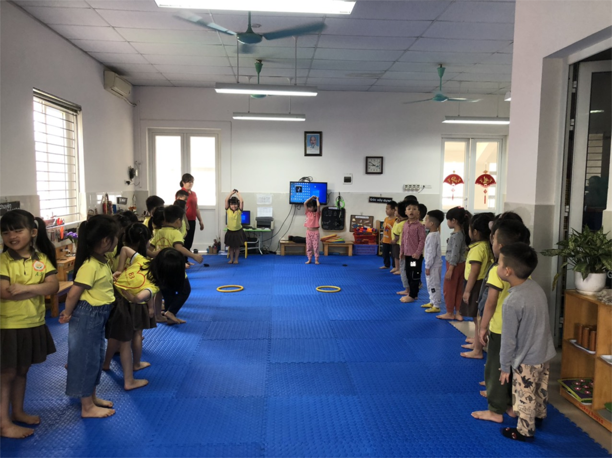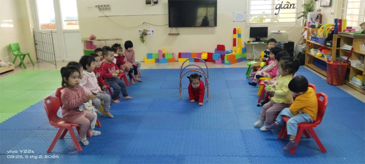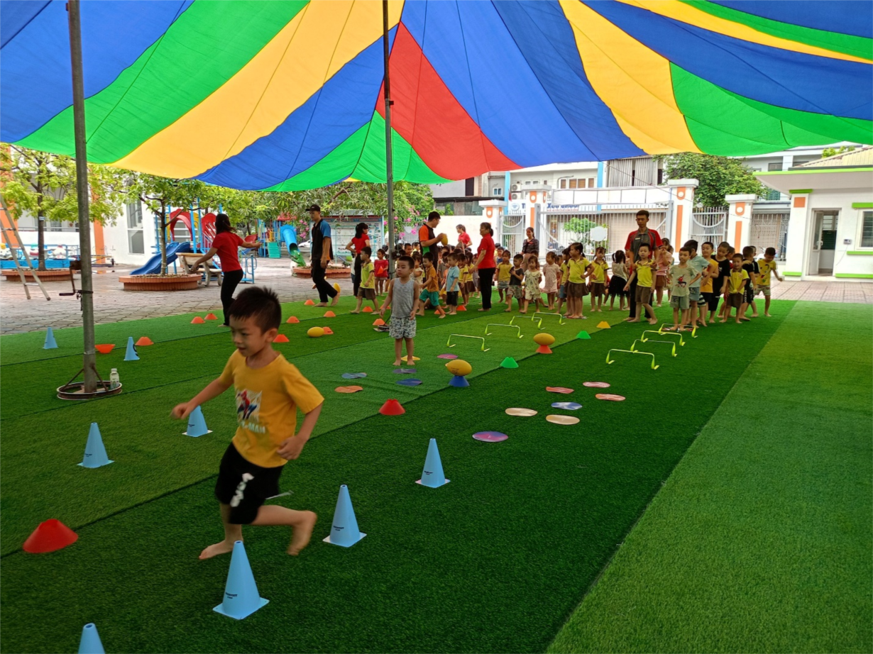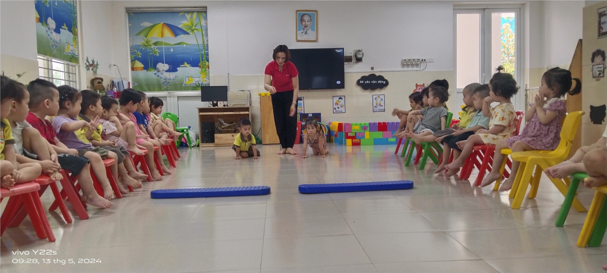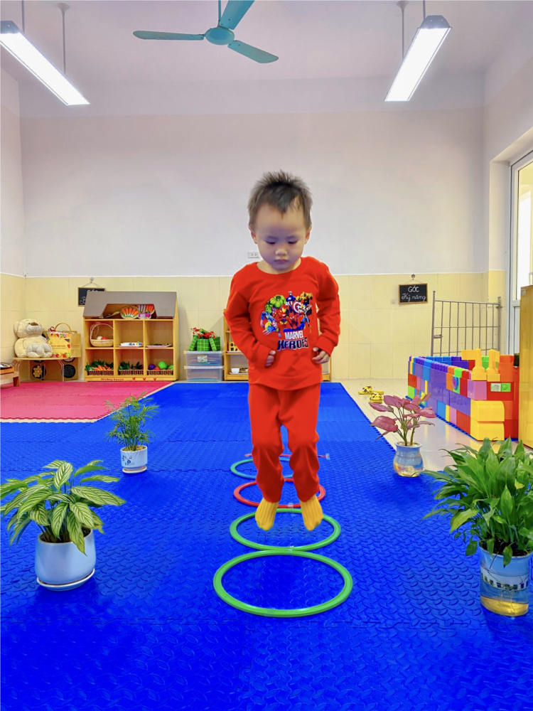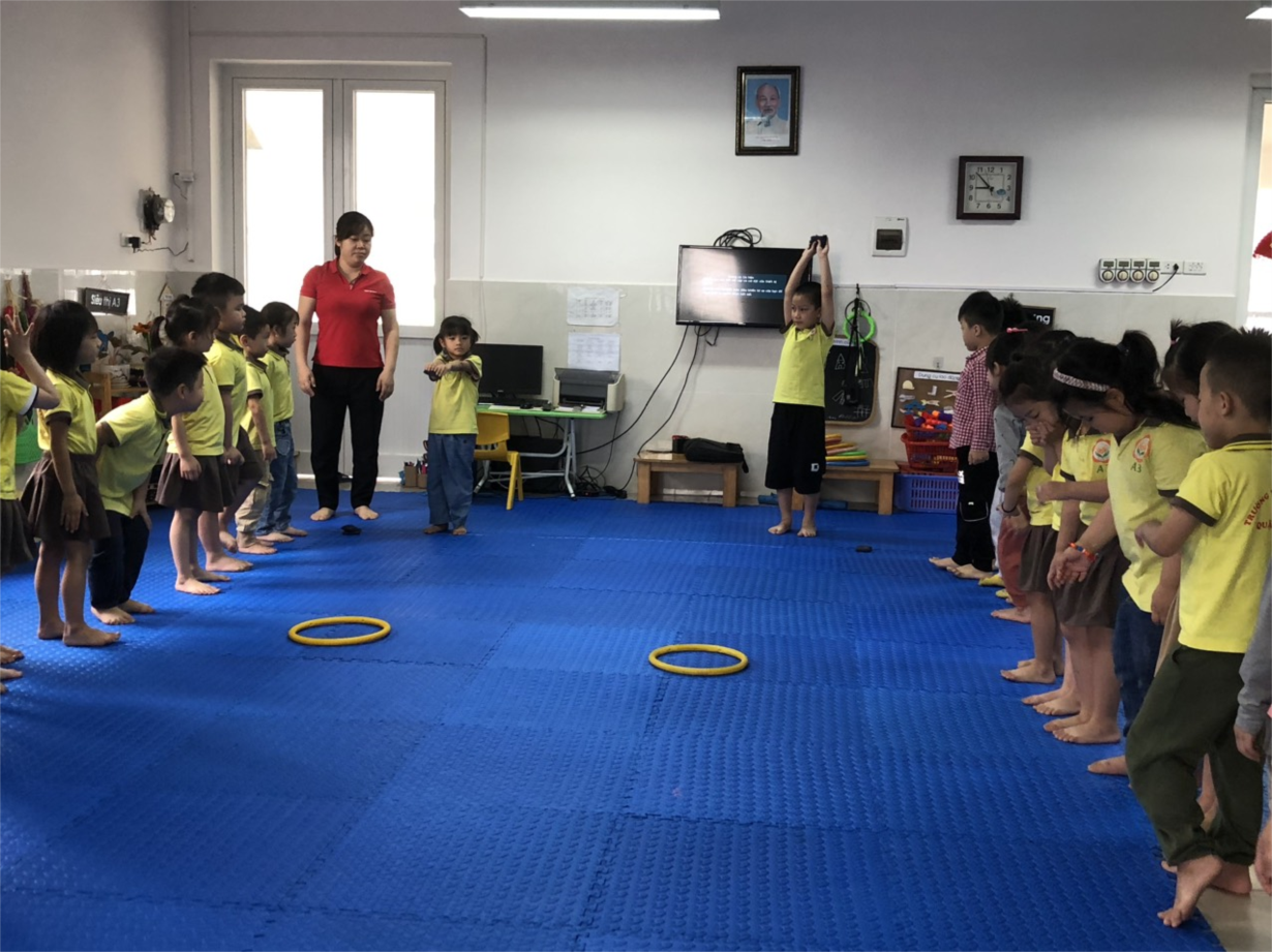 Hình ảnh các bé lớp MGN B1 với hoạt động bật liên tục qua vòng.
