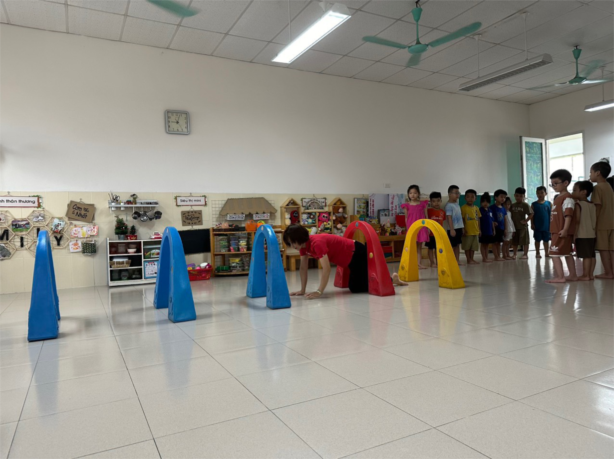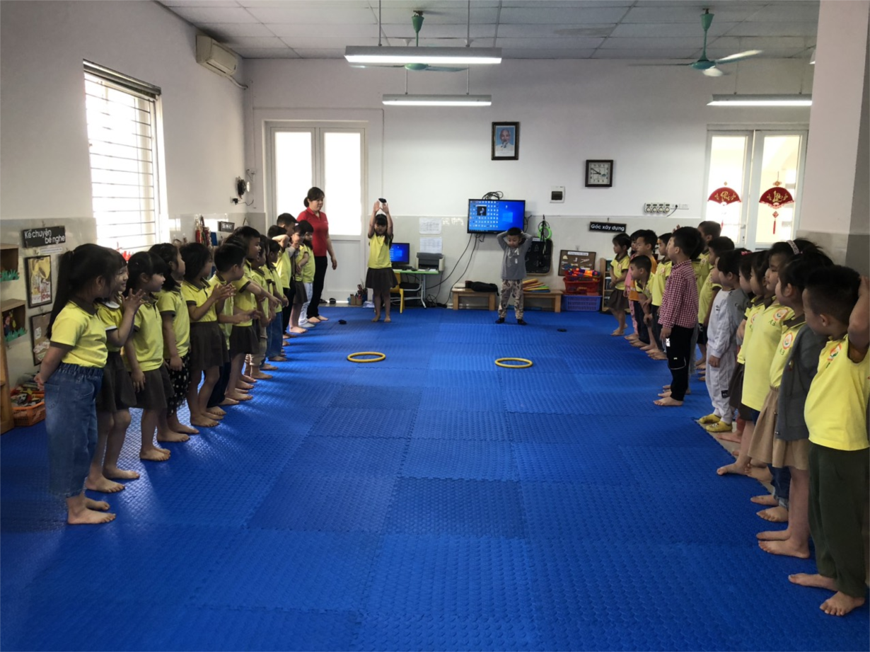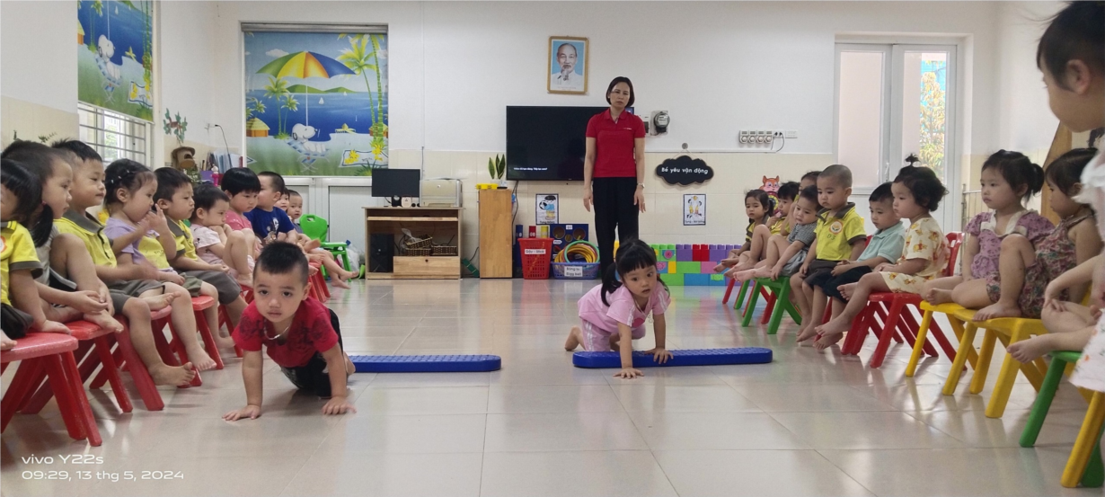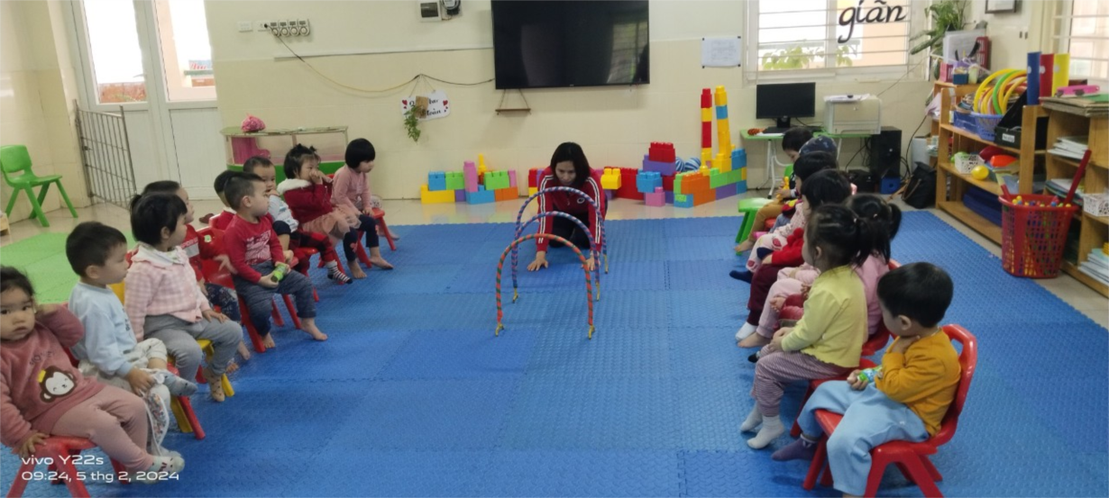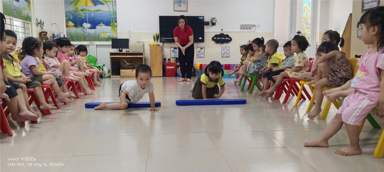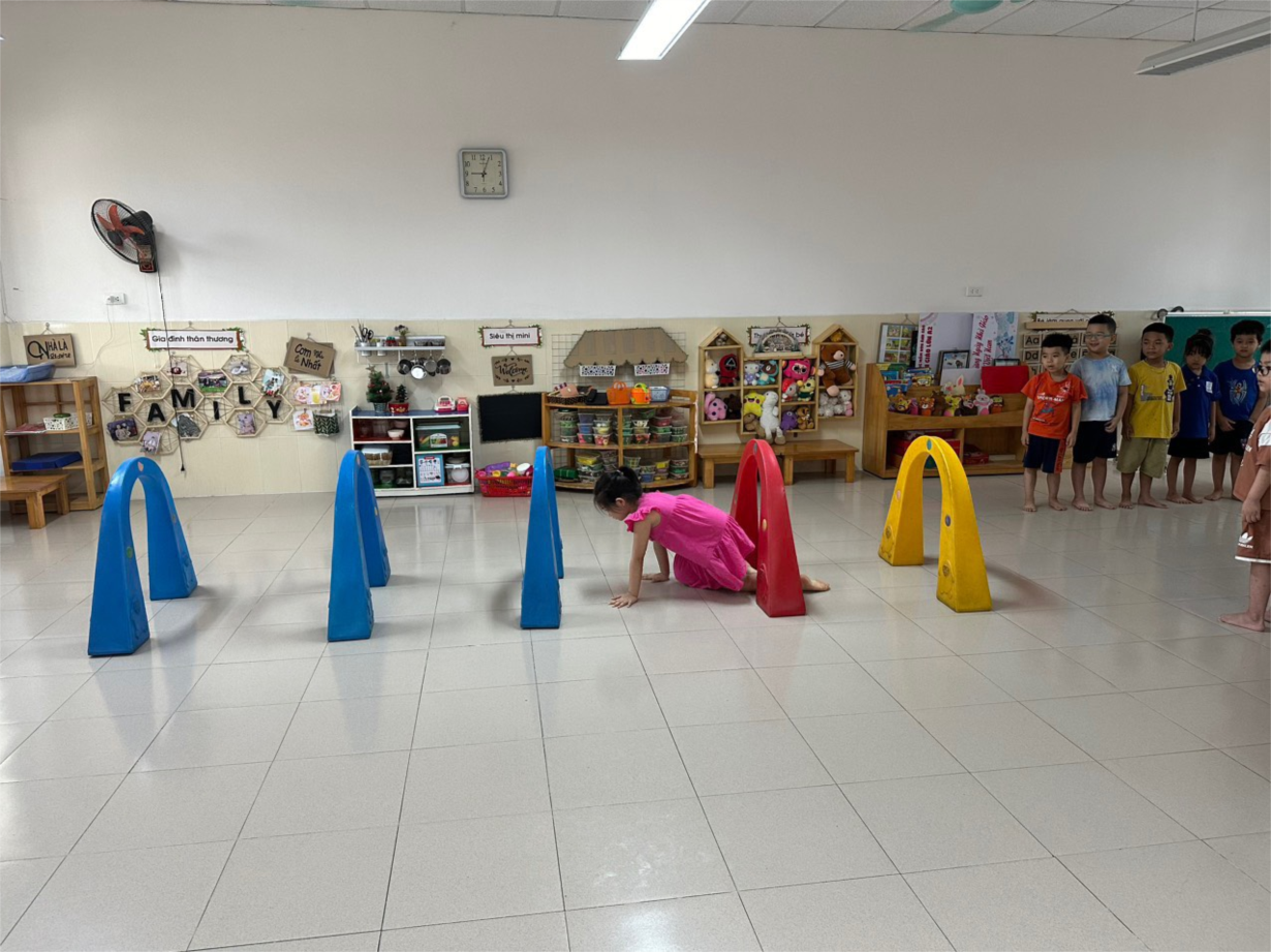 Hình ảnh các bé lớp MGN B1 với hoạt động bật liên tục qua vòng.