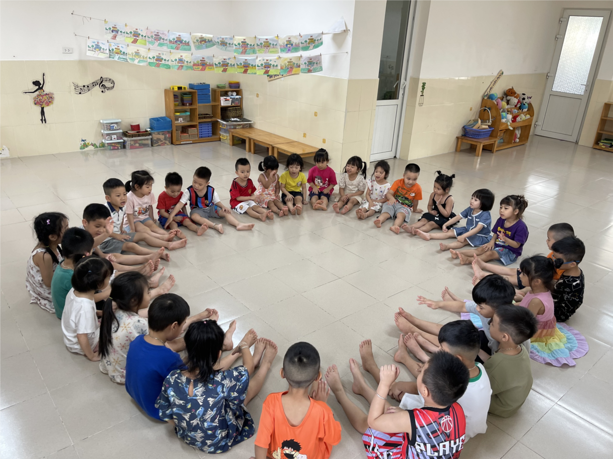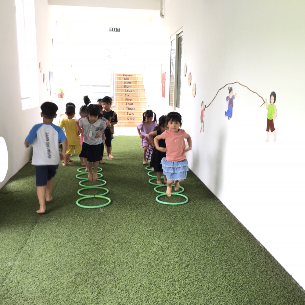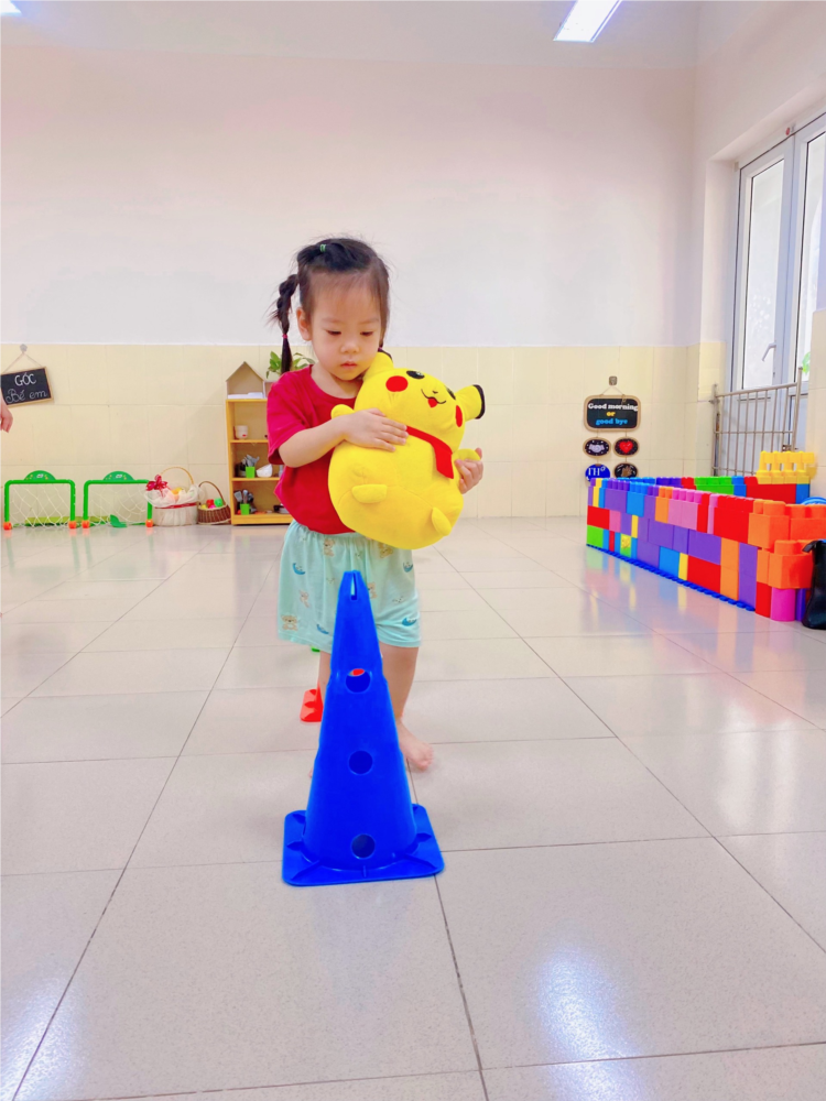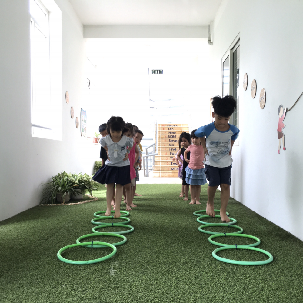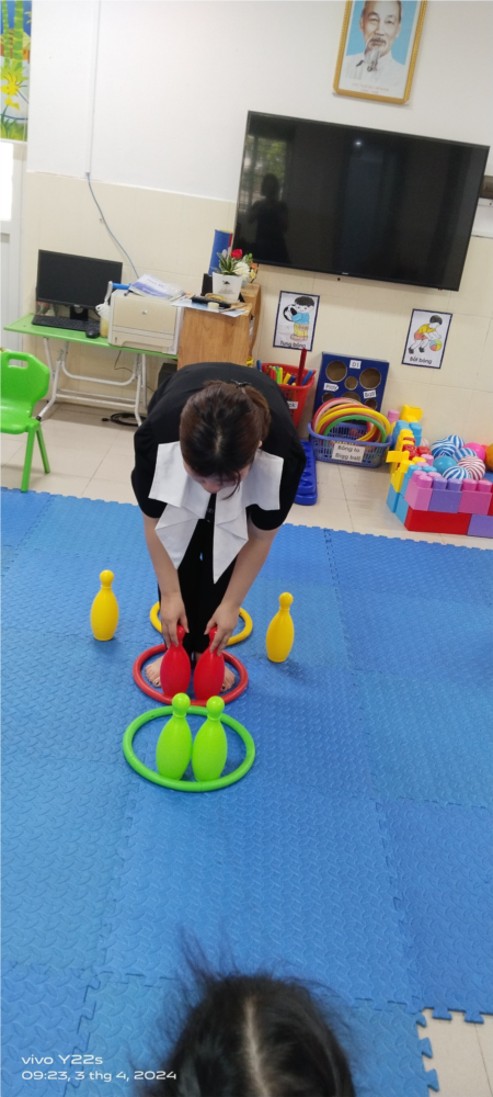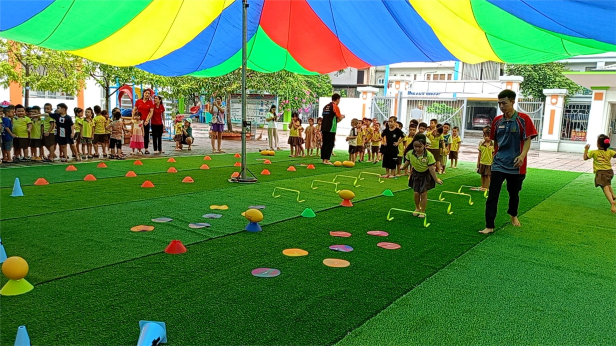 Hình ảnh các bé lớp MGN B1 với hoạt động bật liên tục qua vòng.