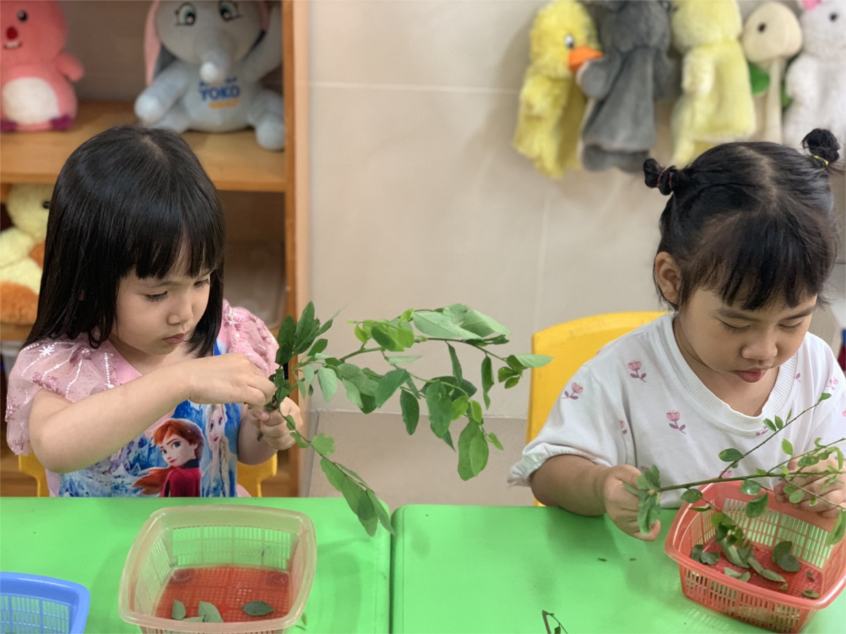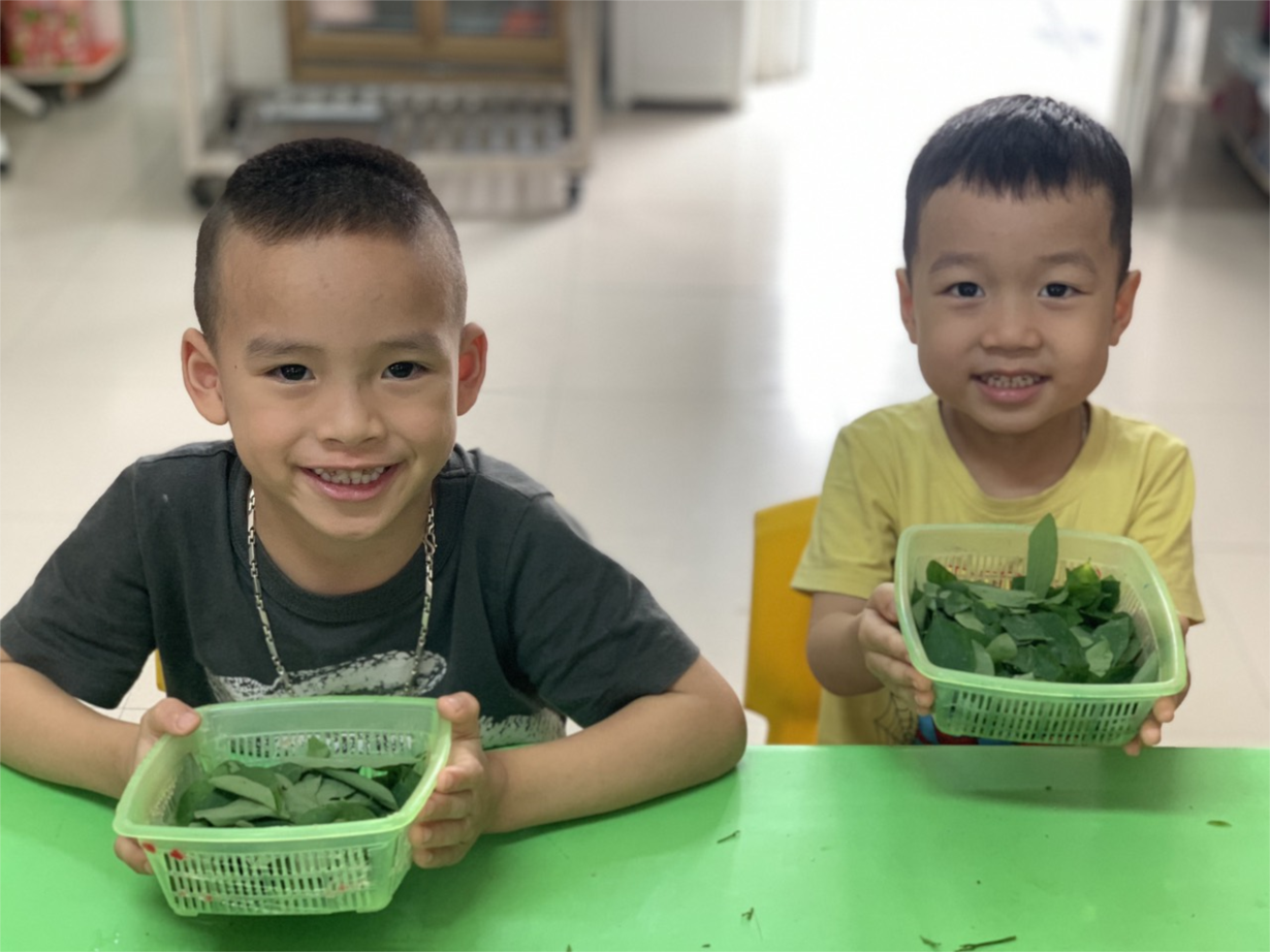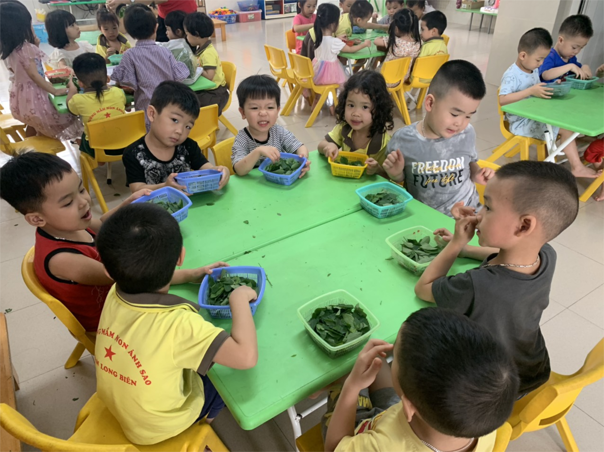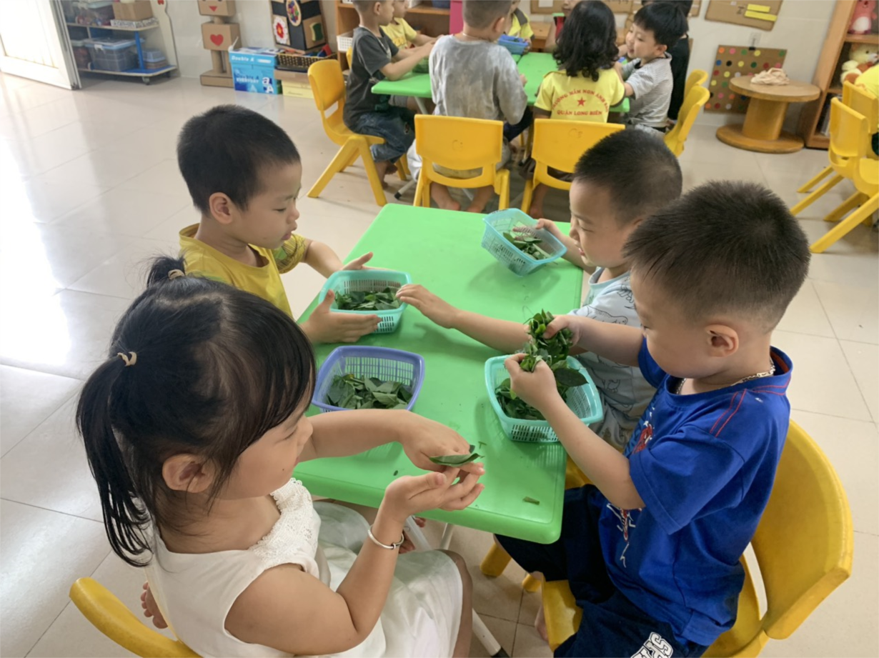 Hình ảnh các bé lớp C3 thực hành tuốt rau ngót