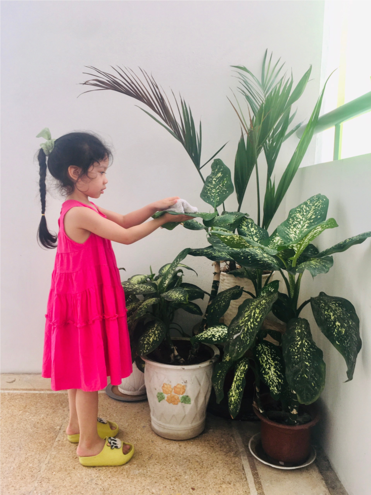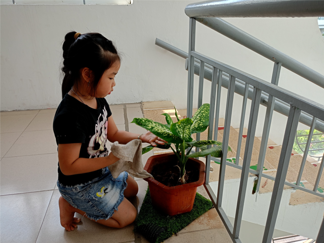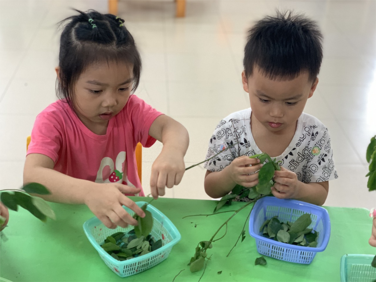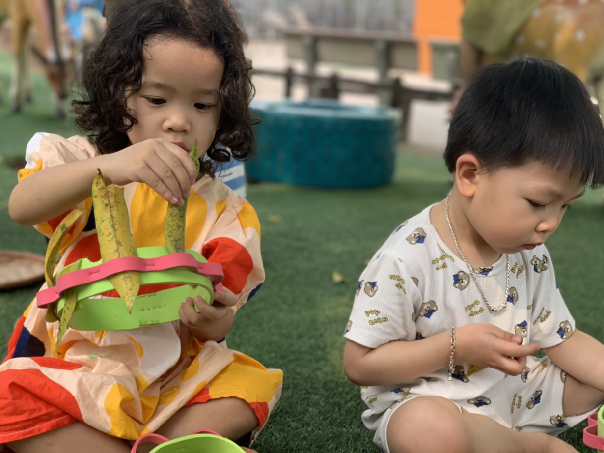 Hình ảnh các bé lớp C3 thực hành tuốt rau ngót