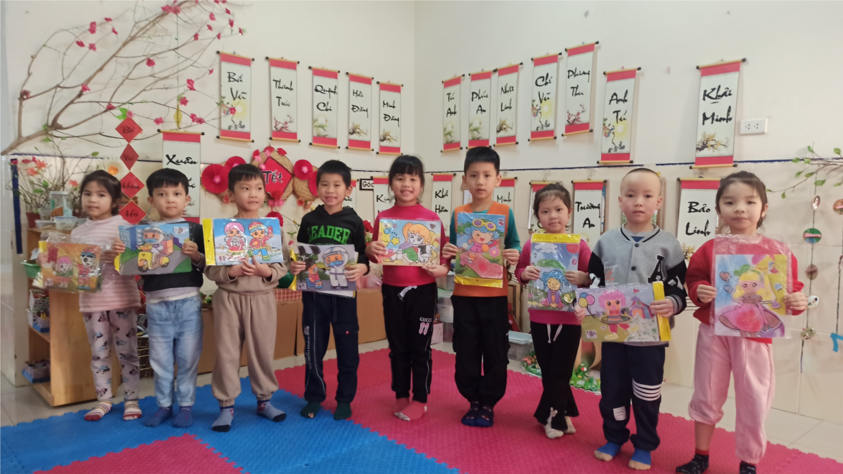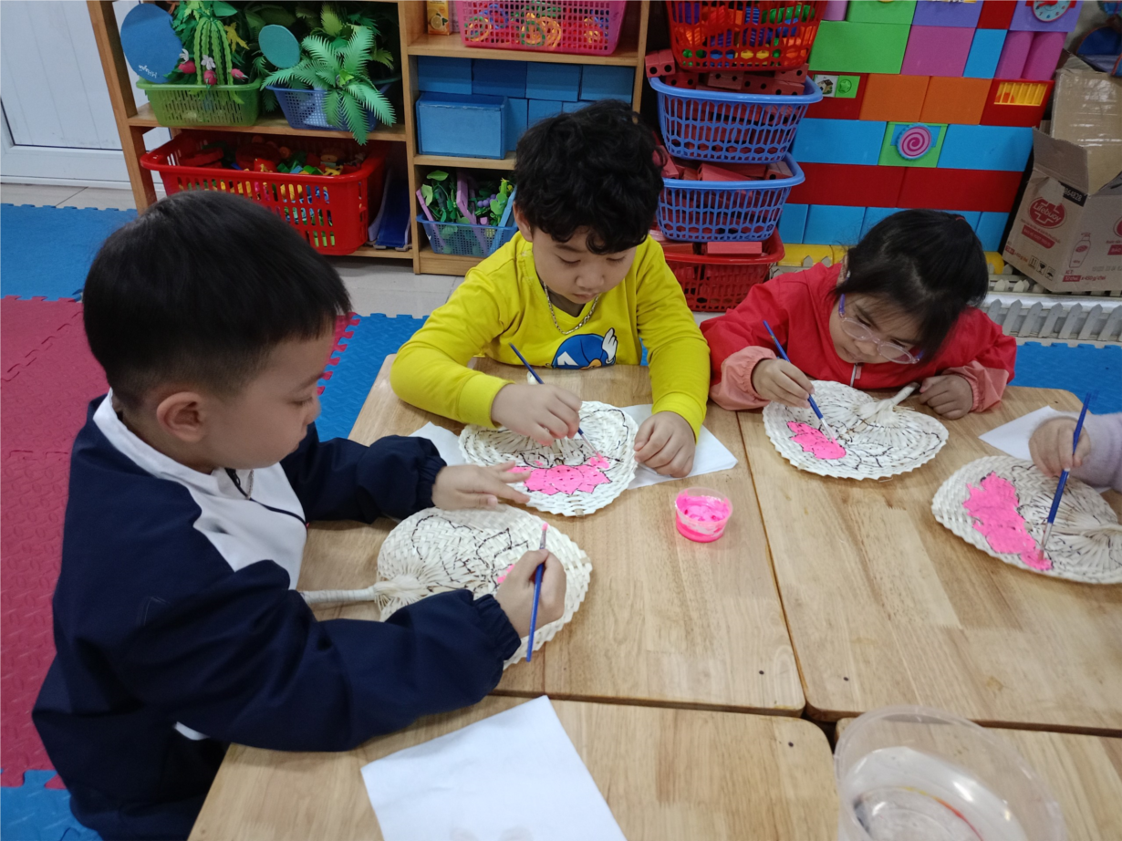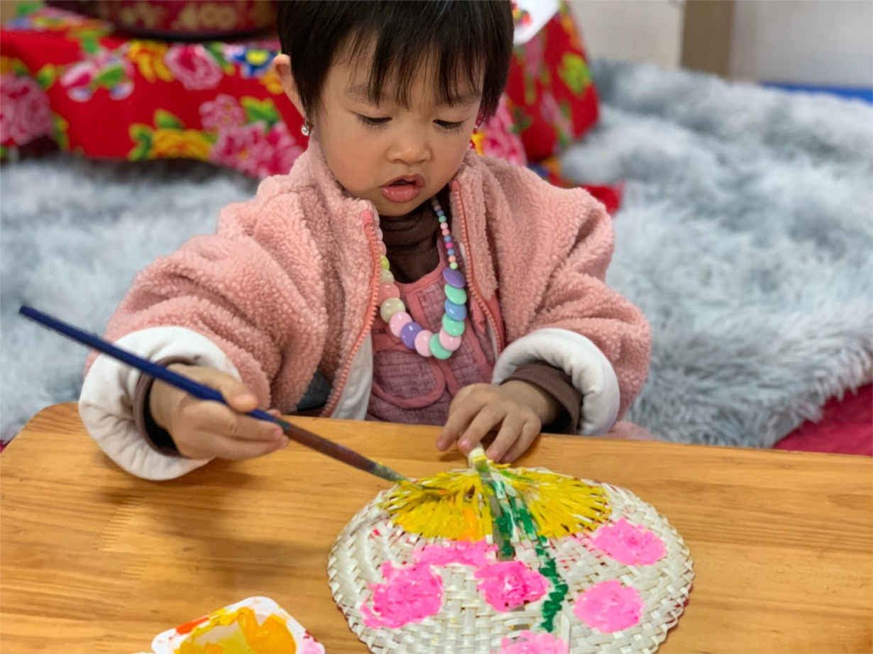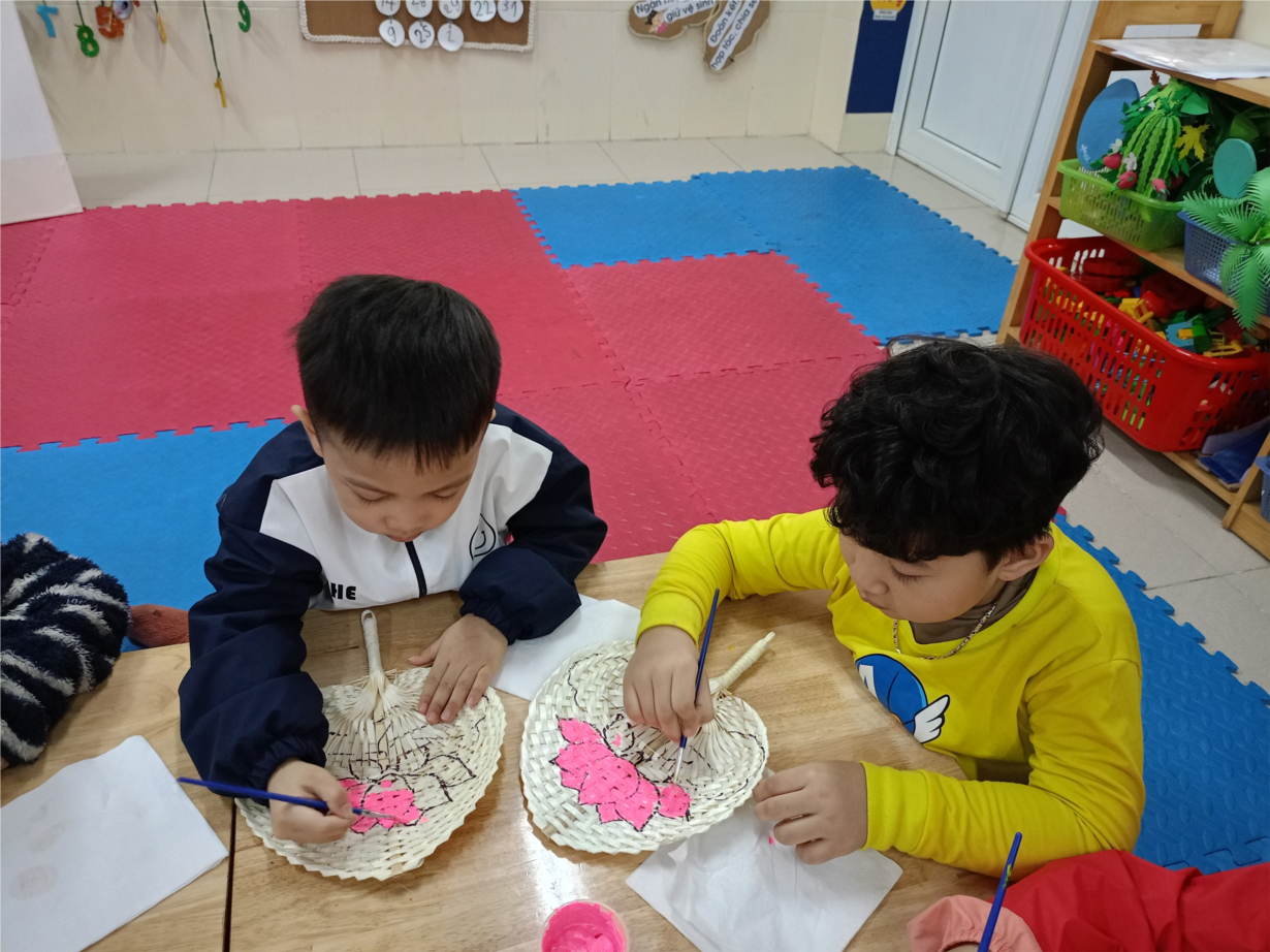 Các bé MGN B4 trang trí quạt làm quà tặng bà và mẹ nhân ngày 8/3