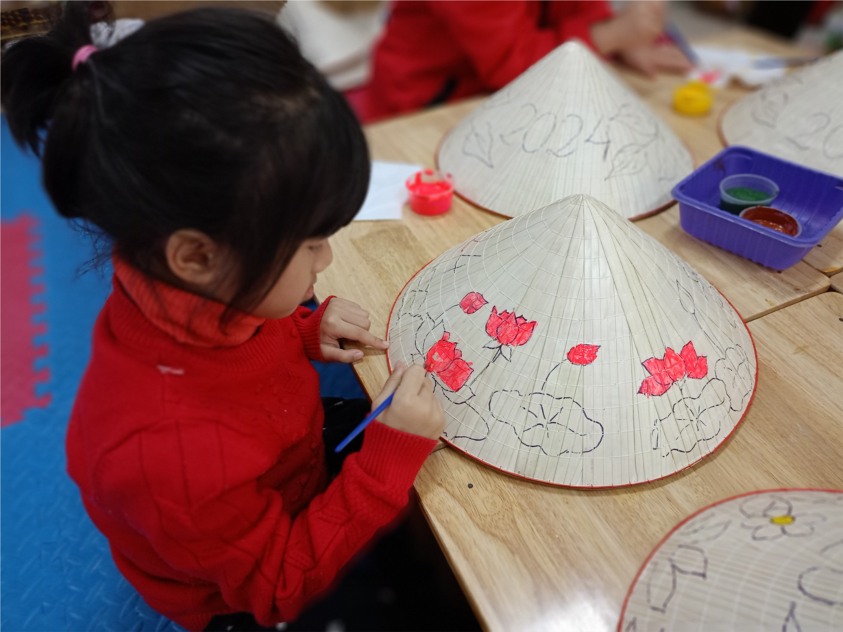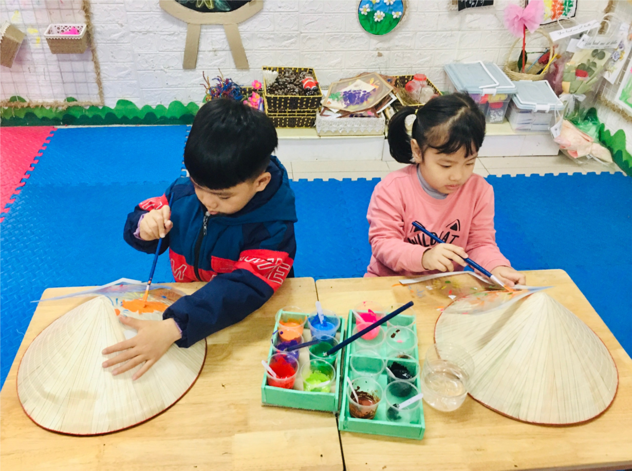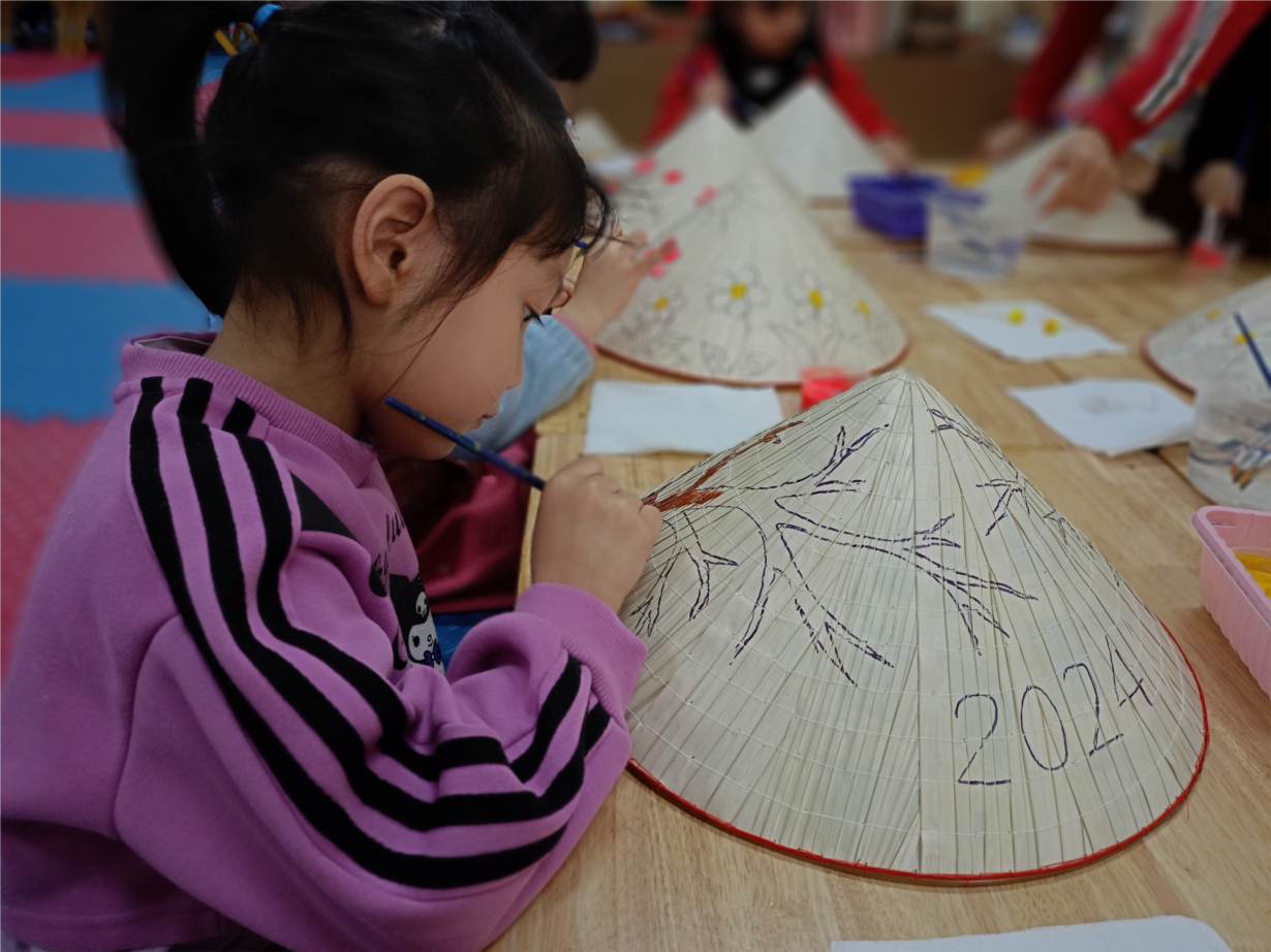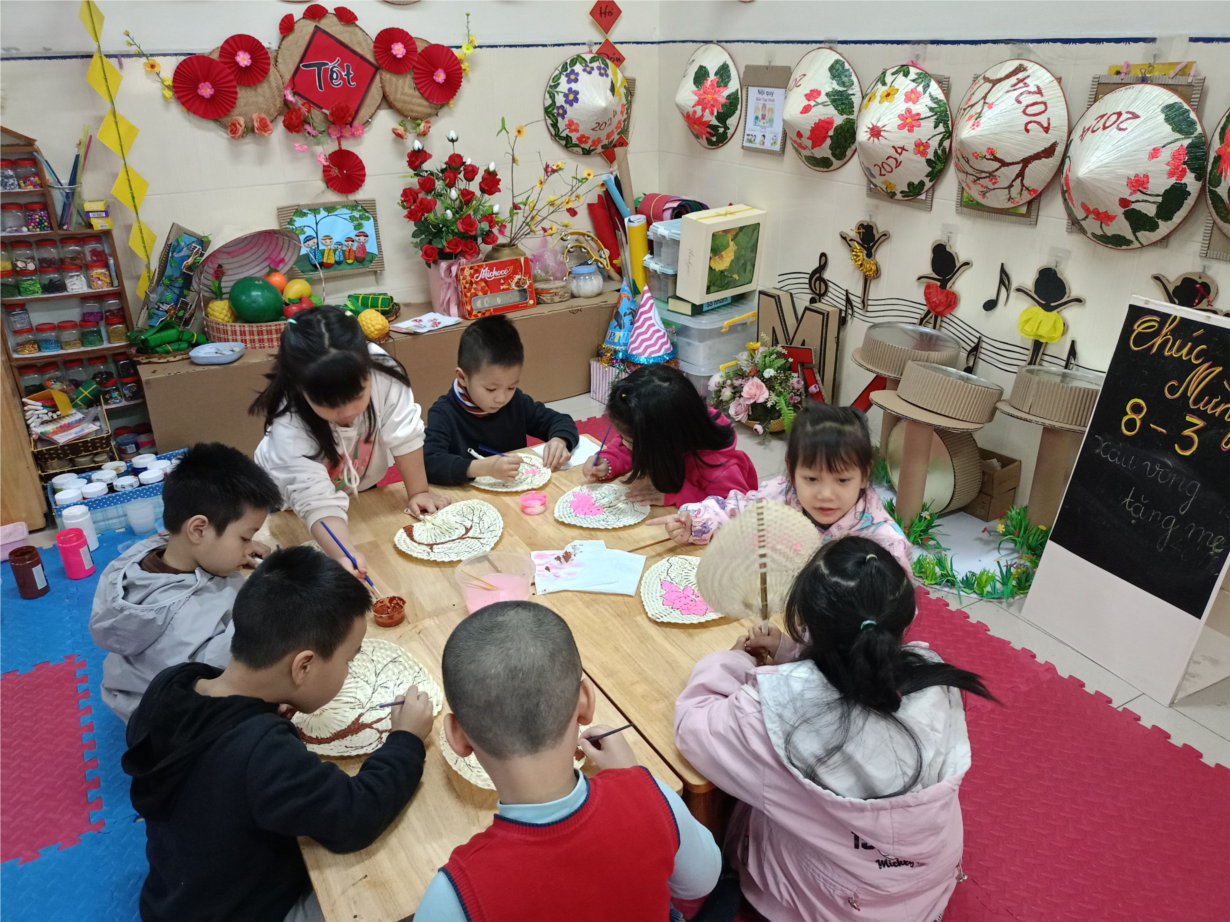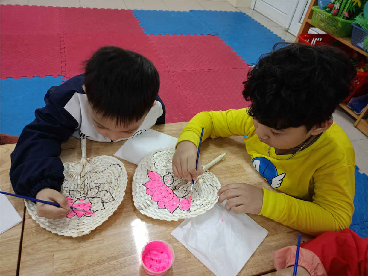Các bé MGN B4 trang trí nón làm quà tặng bà và mẹ nhân ngày 8/3
