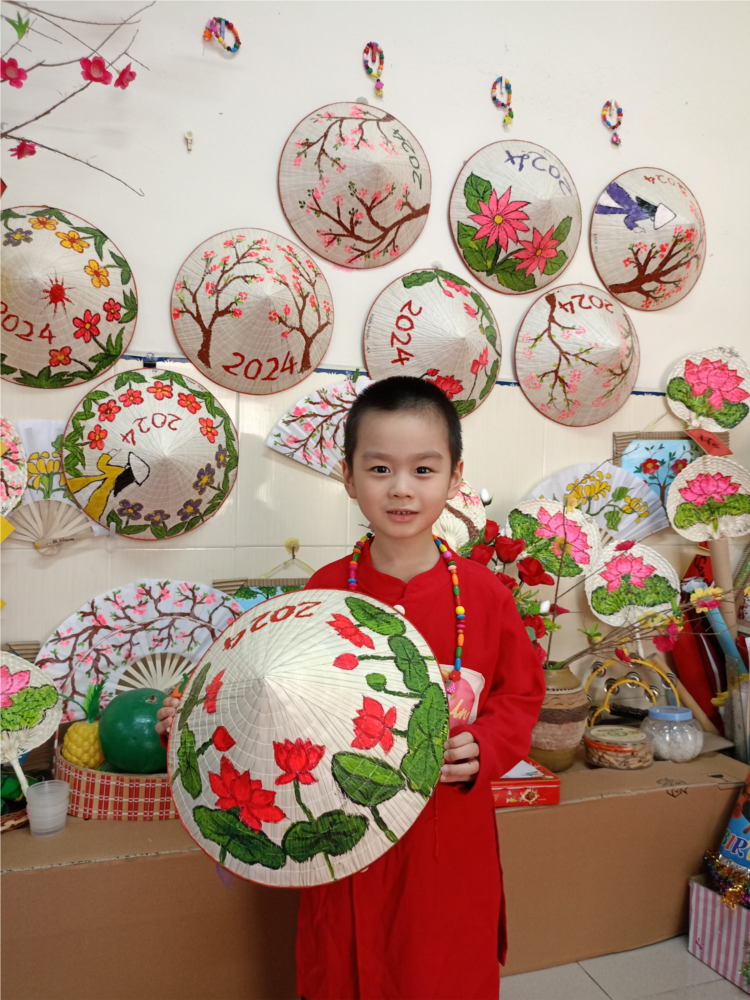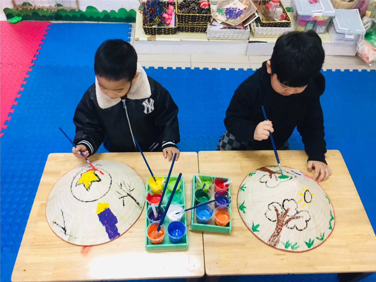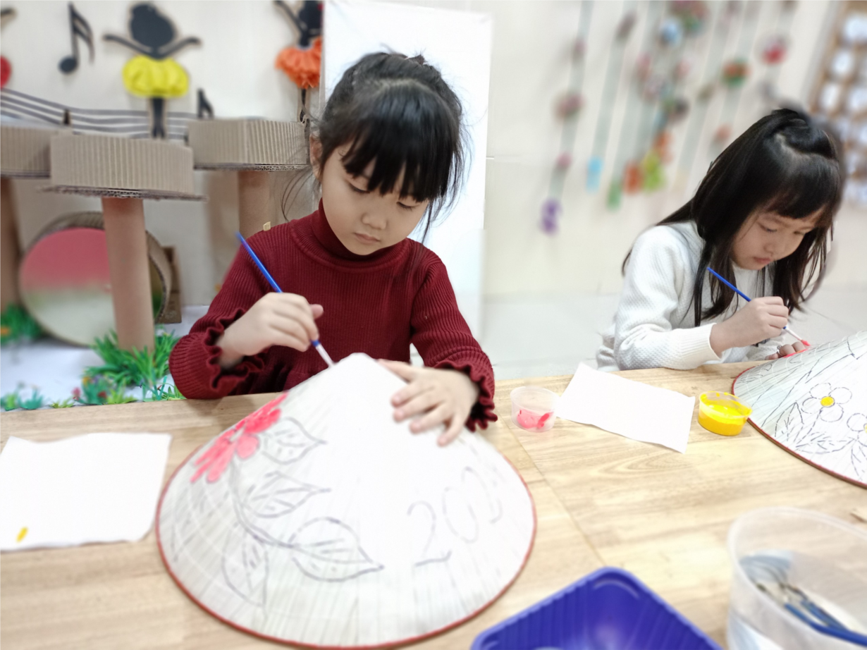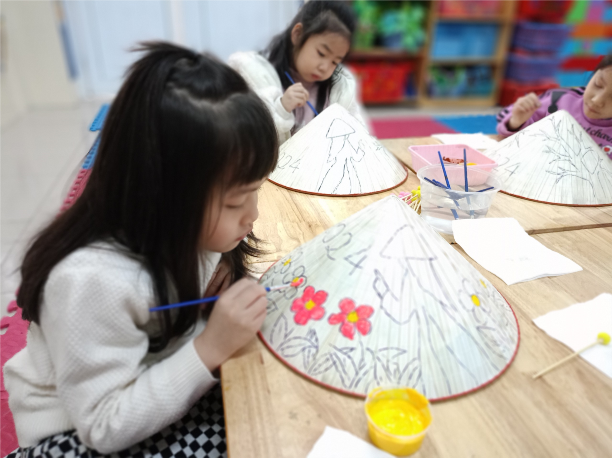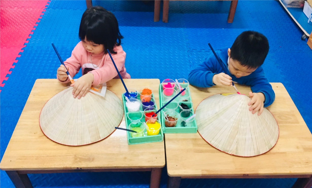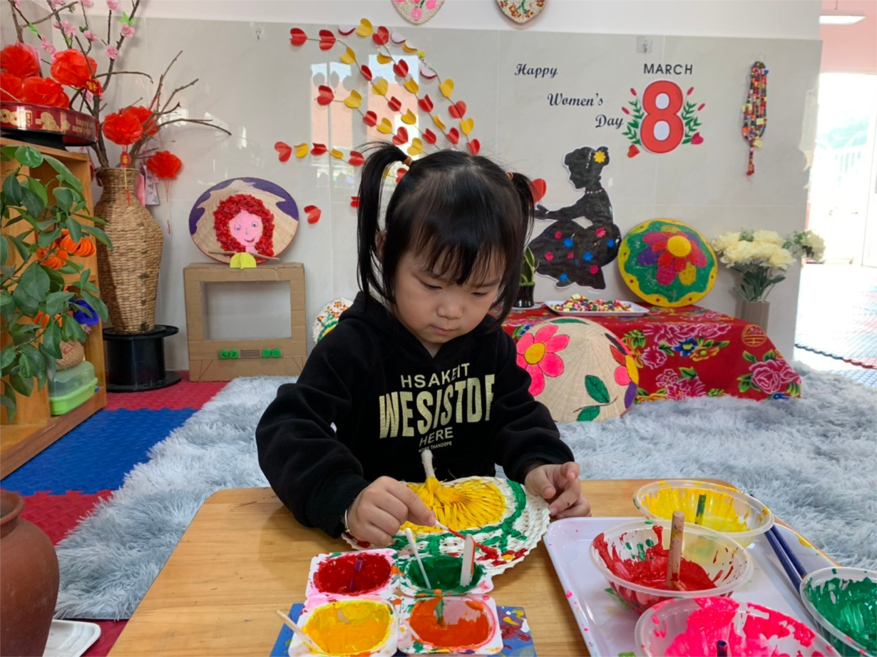 Các bé MGN B4 trang trí nón làm quà tặng bà và mẹ nhân ngày 8/3