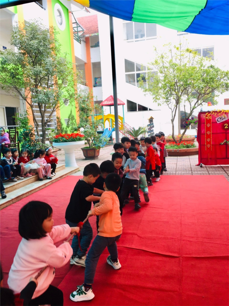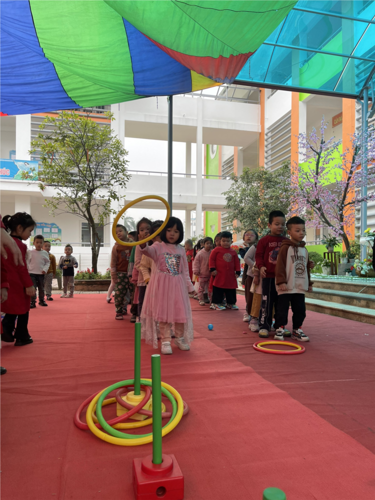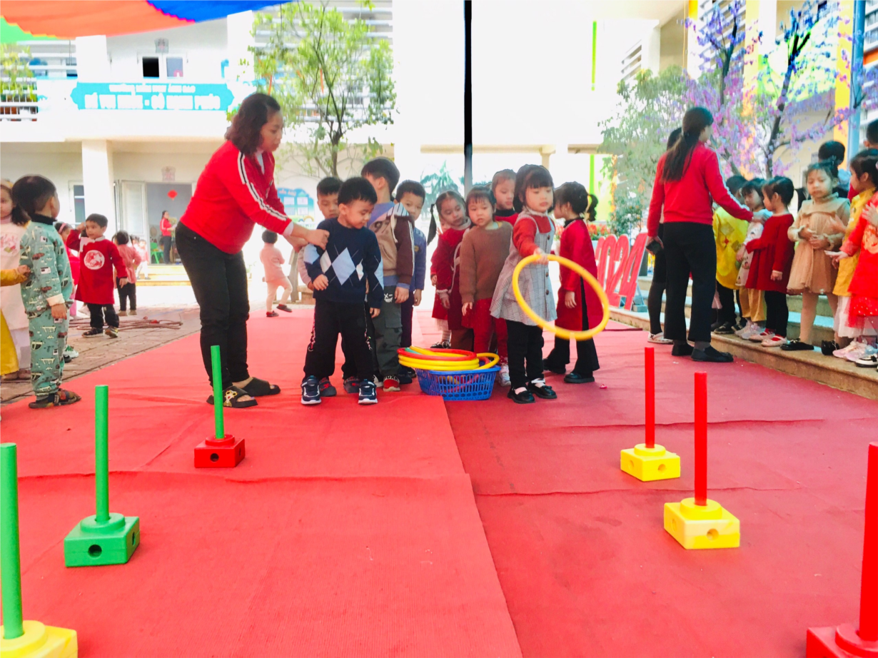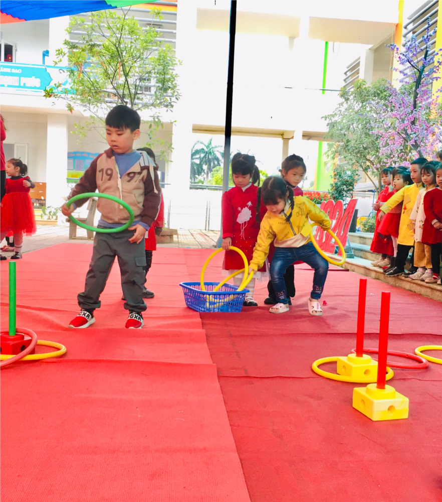 Hình ảnh các bé lớp mẫu giáo nhỡ B1 tham gia ngày hội trò chơi dân gian.