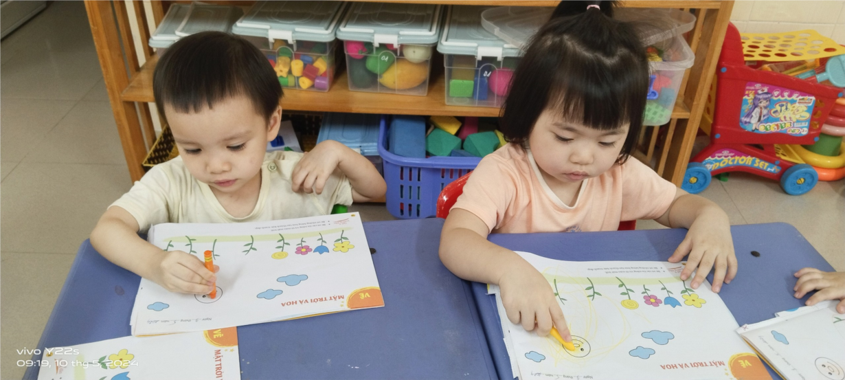 CÁC BÉ LỚP D1 TÔ MÀU BÔNG HOA, ÔNG MẶT TRỜI, ĐÁM MÂY