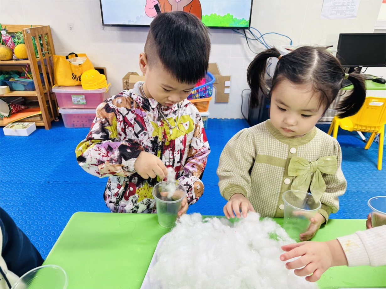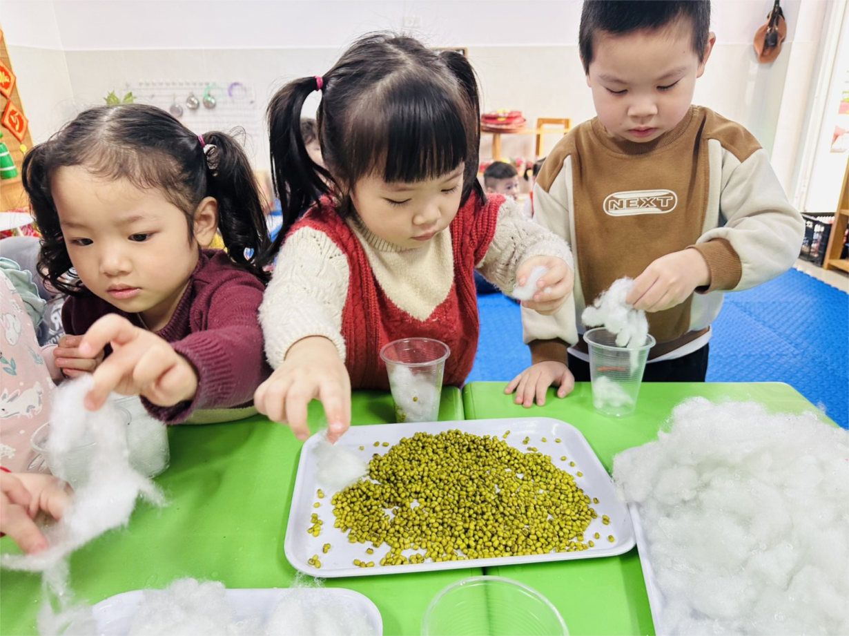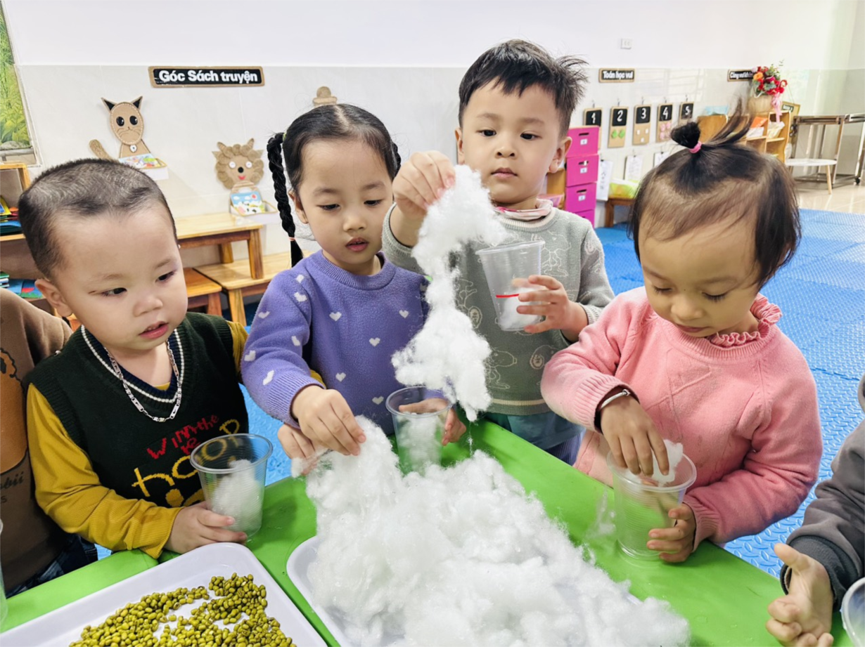 Hình ảnh các bé lớp C1 tham gia trải nghiệm làm giá đỗ.