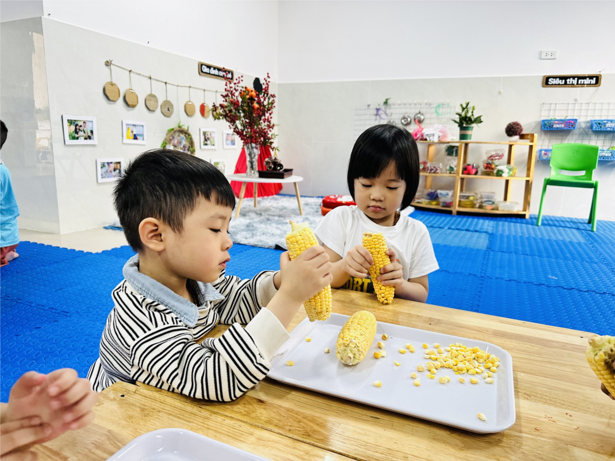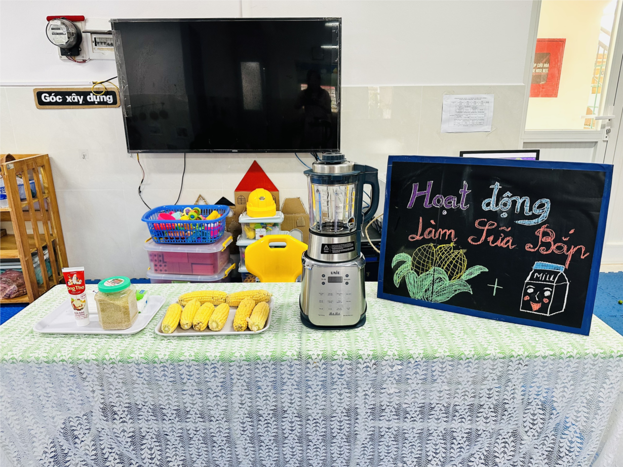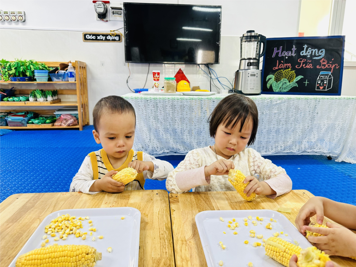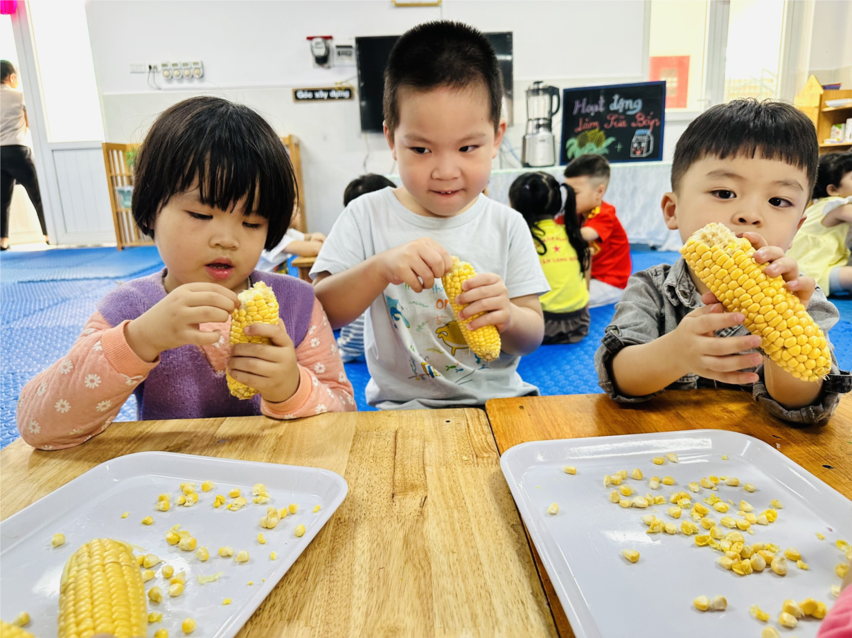 Các bé lớp C1 cùng tham gia hoạt động làm sữa ngô.