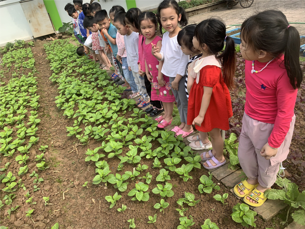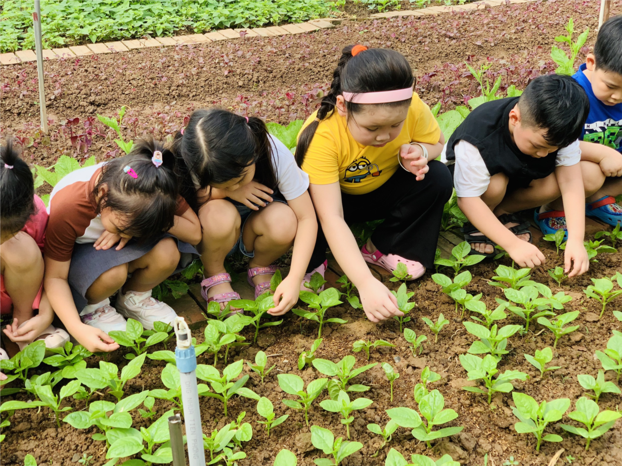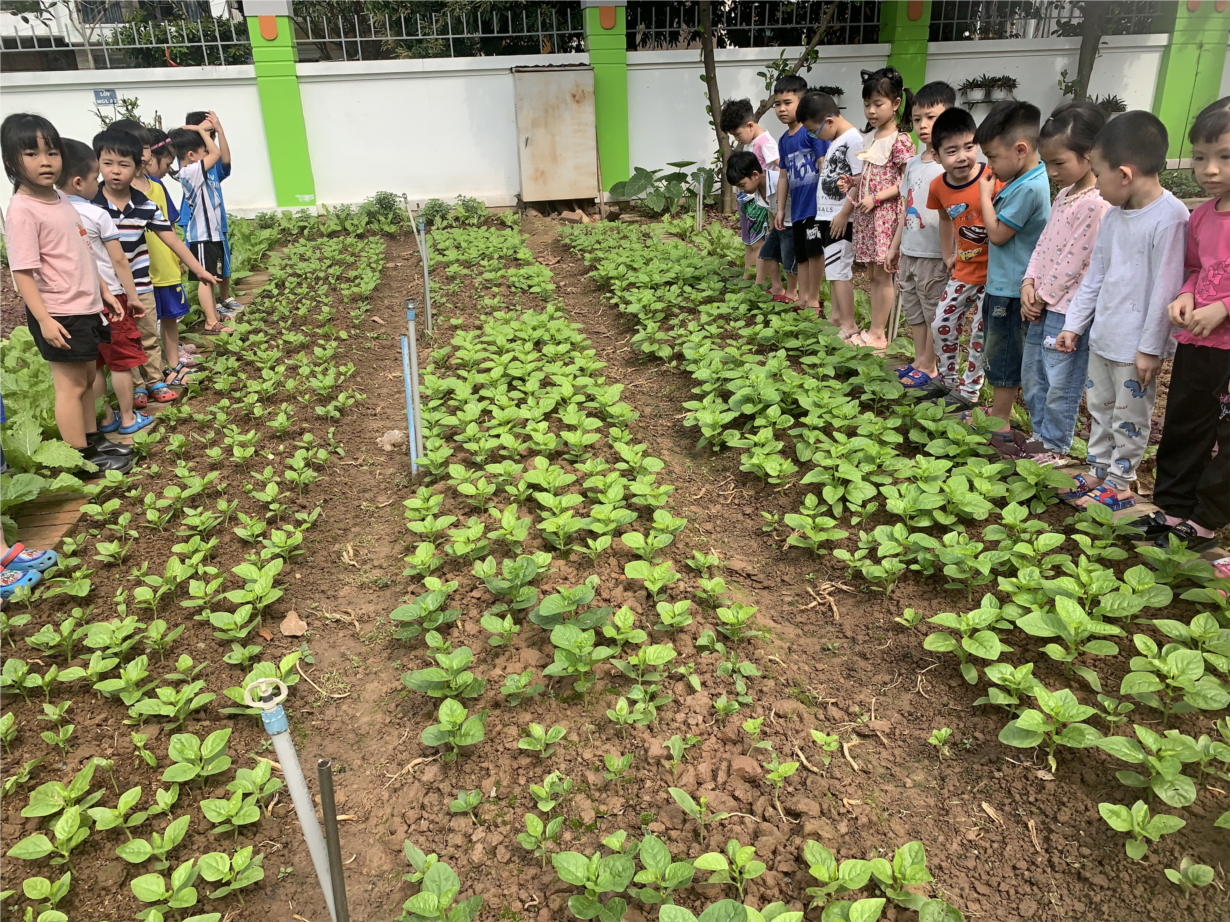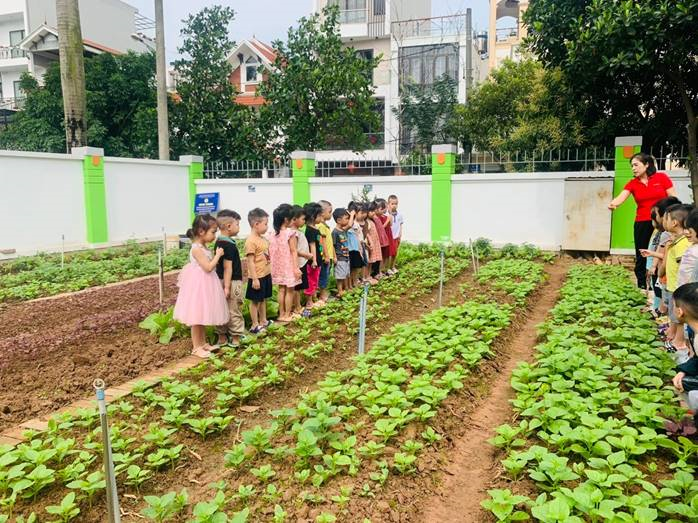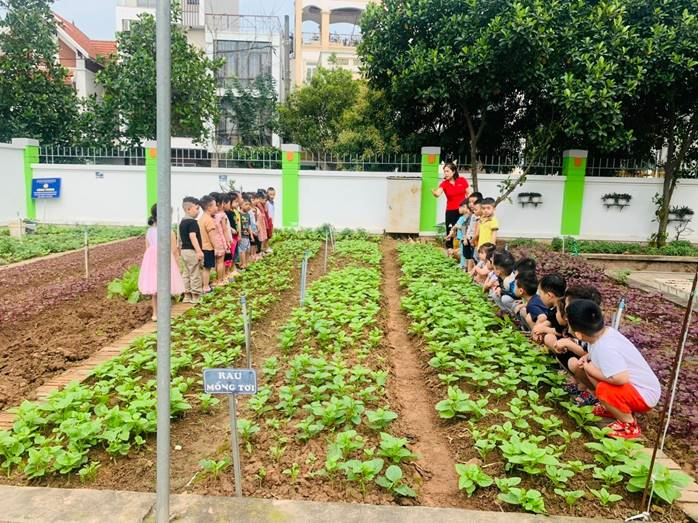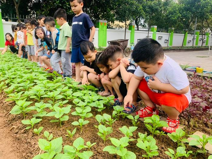 Các bạn nhỏ lớp MGN B2 tham quan vườn rau của trường.