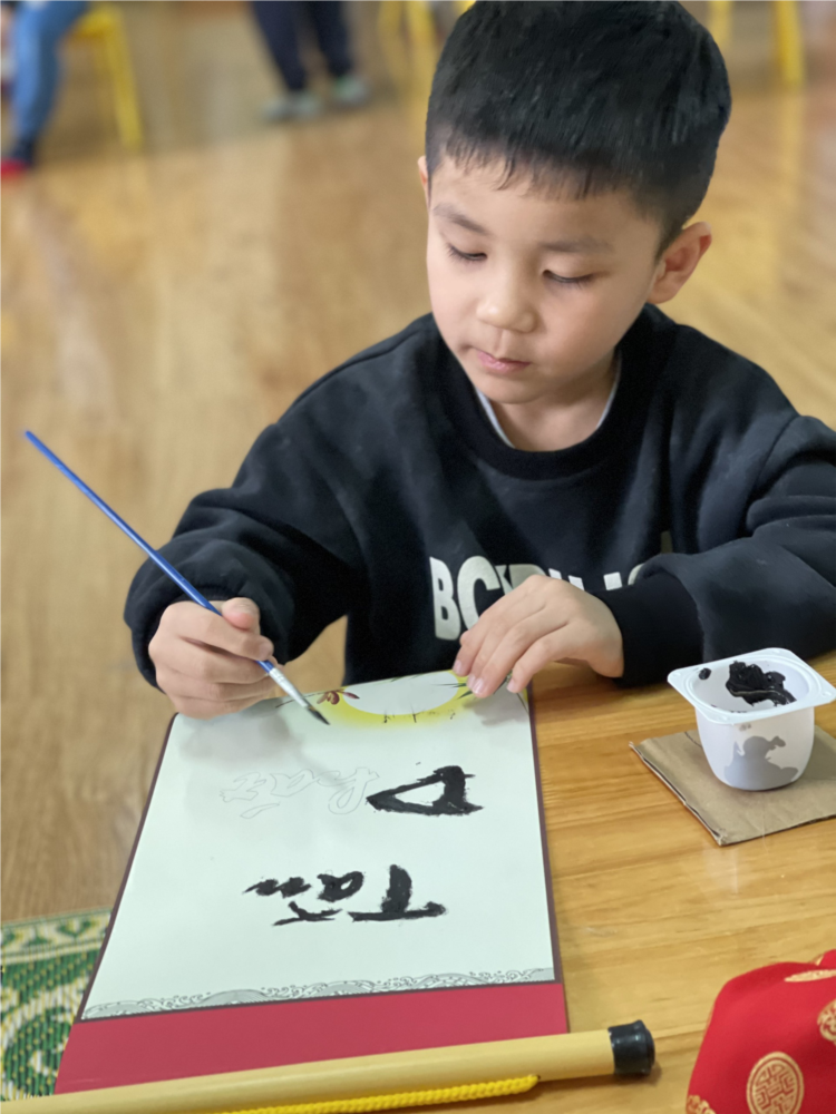Hình ảnh các bé lớp mẫu giáo nhỡ B1 viết thư pháp mừng năm mới.