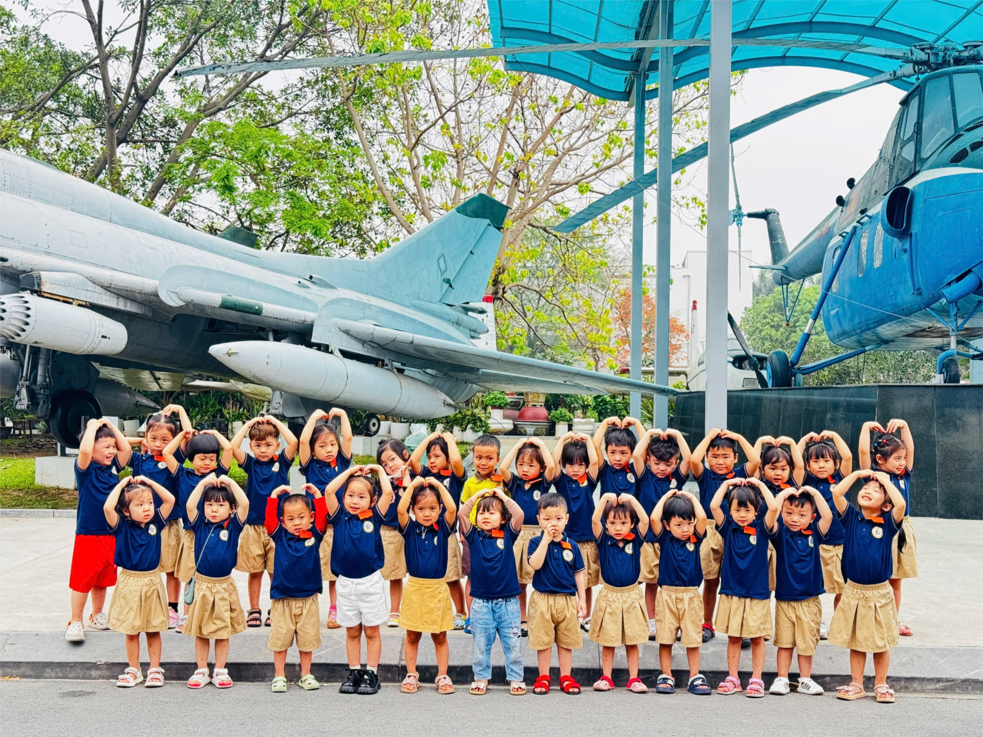 Tạm xa lớp học vài tiếng đồng hồ, các con đã có một buổi dã ngoại vô cùng ý nghĩa, không gian học tập được thay thế không gian rộng lớn, oai hùng. Các con đã tận mắt chứng kiến bộ sưu tập đồ sộ vũ khí, tên lửa, trực thăng, những vật dụng và hình ảnh giới thiệu chiến công xuất sắc của bộ đội Phòng không – Không quân trong hành trình chiến đấu bảo vệ đất nước.