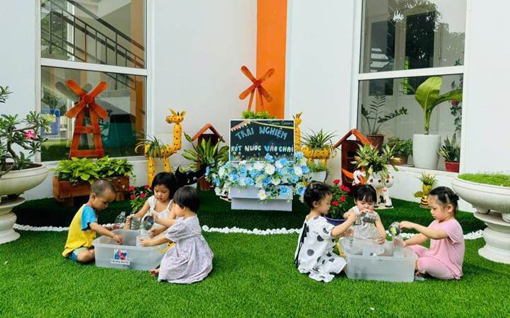 Các bé đang say sưa rót nước và chai.