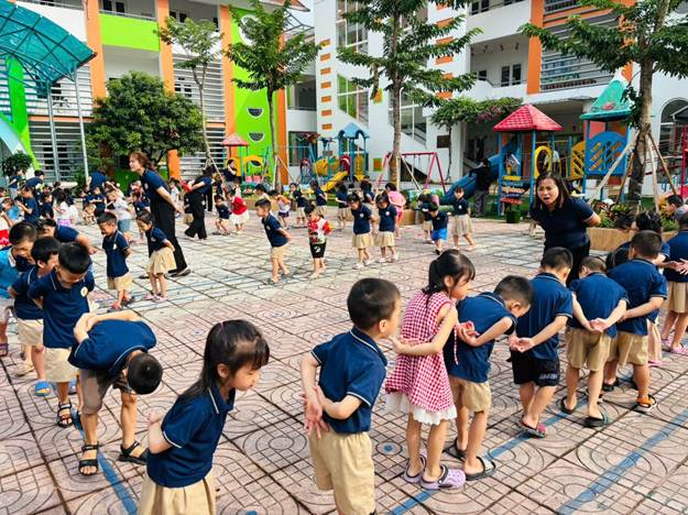 Các bạn nhỏ lớp MGL A3 tham gia thể dục sáng dưới sân trường.