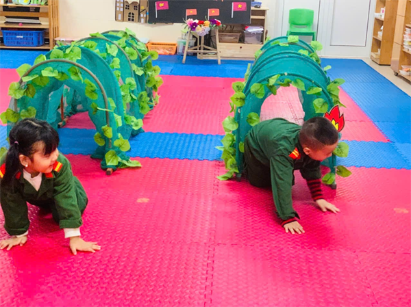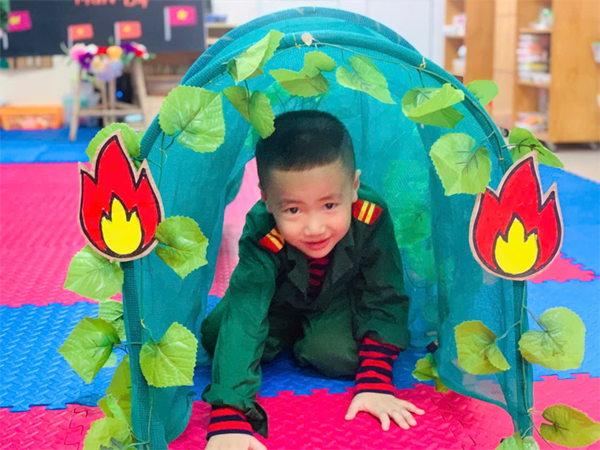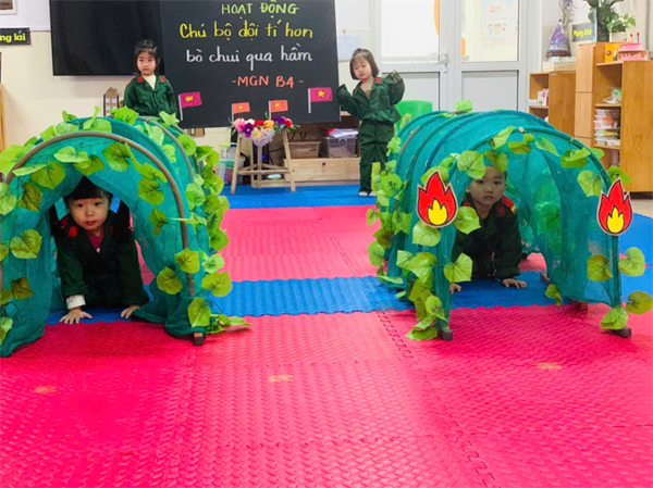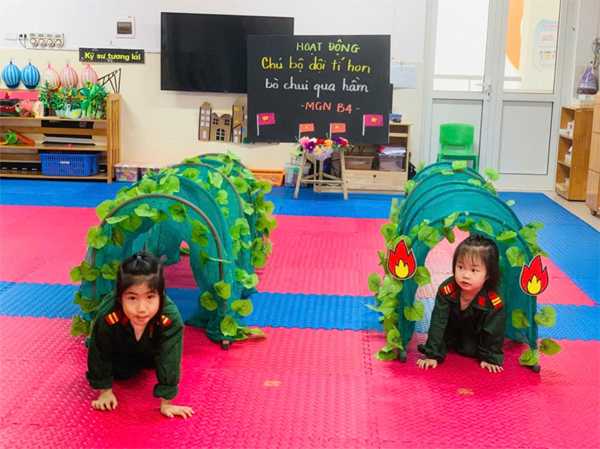 Tập ảnh : Các bé MGN B4 làm các chú bộ đội bò chui qua hầm