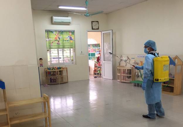 Trước tình hình dịch bệnh Covid-19, thực hiện hướng dẫn của Ban chỉ đạo phòng chống dịch bệnh Covid-19 quận Long Biên, phòng Giáo dục và Đào tạo quận về việc tiếp tục duy trì các biện pháp phòng chống dịch bệnh Covid-19. Sáng nay, ngày 07/05/2020, trường Mầm non Ánh Sao phối hợp với trạm y tế phường Thượng Thanh thực hiện phun khử khuẩn bằng Cloramin B và tổng vệ sinh toàn bộ các khu vực trong nhà trường như: lớp học, phòng chức năng, bếp ăn, nhà bệ sinh.... đảm bảo môi trường sạch sẽ, an toàn để đón học sinh quay trở lại trường học vào sáng thứ hai, ngày 11/5/2020.