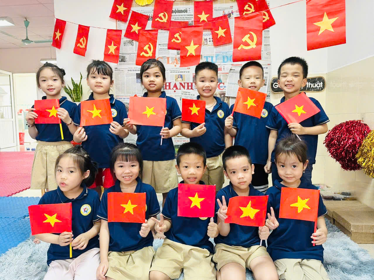 Hoạt động diễn ra trong không khí vui tươi, sôi nổi. Dưới sự hướng dẫn của cô giáo, các bé được tự tay làm nên những chiếc vòng tay nhiều màu sắc, trang trí bằng các họa tiết hình cờ Tổ quốc, ngôi sao 5 cánh – biểu tượng của lá cờ Tổ Quốc của đất nước Việt Nam