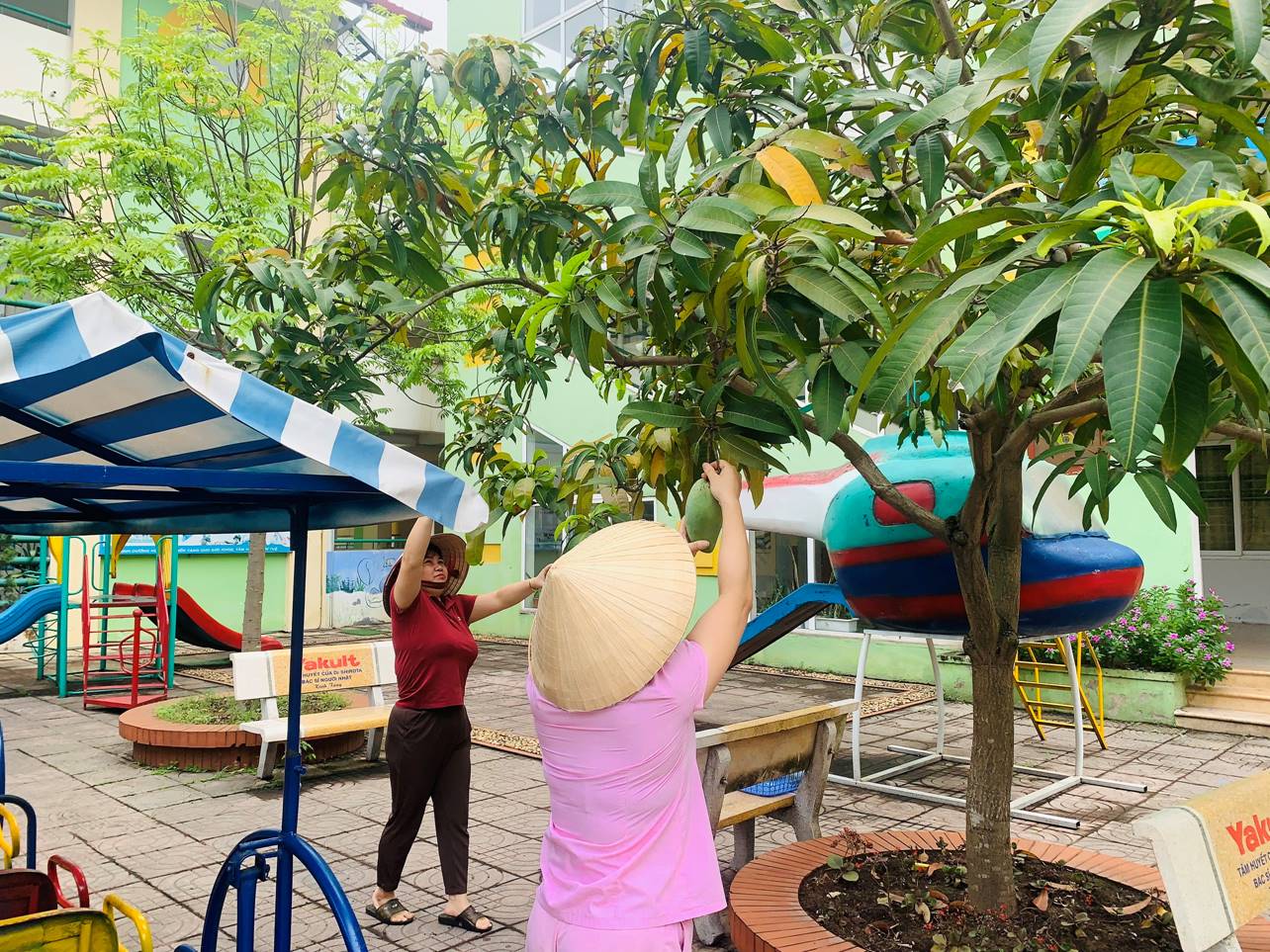Ngoài các cô giáo, còn có sự giúp sức của bác bảo vệ và các bạn học sinh cũng đang hứng thú đi thu hoạch trái xoài.