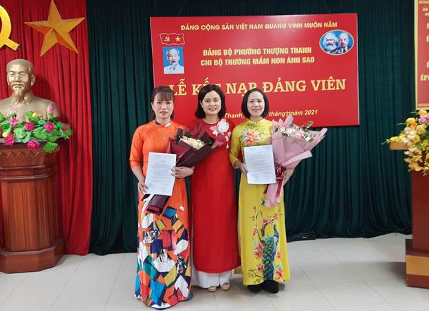 Hôm nay ngày 20 tháng 11 năm 2021, chi bộ Trường MN Ánh Sao long trong tổ chức lễ kết nạp Đảng viên cho quần chúng Trương Thị Quỳnh Nga và quần chúng Nguyễn Thị Cường theo quyết định của Ban thường vụ Đảng ủy quận Long Biên. Căn cứ vào quy định Điều lệ Đảng cộng sản Việt Nam, được sự quan tâm của chi bộ trường MN Ánh Sao và Đảng ủy phường Thương Thanh. Trải qua quá trình tu dưỡng và rèn luyện của quần chúng Trương Thị Quỳnh Nga và quần chúng Nguyễn Thị Cường, với sự quan tâm giúp đỡ của các đồng chí Đảng viên trong chi bộ, các đồng chí trong các Ban ngành đoàn thể trong trường, đến hôm nay các đồng chí đã được đứng trong hàng ngũ của Đảng. Xin chúc mừng hai đồng chí đảng viên mới, chúc các đồng chí luôn phát huy những ưu điểm của mình để làm tốt nhiệm vụ, cũng như góp phần xây dựng Chi bộ trường MN Ánh Sao ngày càng vững mạnh, nhà trường ngày càng phát triển hơn nữa.