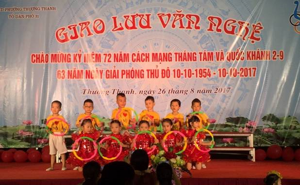 Các bé khối mẫu giáo lớn trường mầm non Ánh Sao tham gia giao lưu văn nghệ chào mừng kỷ niệm 72 năm cách mạng tháng tám và quốc khánh 2/9, 63 năm ngày giải phóng thủ đô 10 – 10 – 2017 tại tổ dân phố 31 – Phường Thượng Thanh.