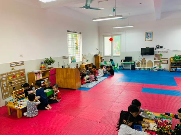 Trẻ tham gia vào các góc chơi ở lớp như: Góc bé chơi đóng vai; Góc ghép hình xây dựng; Góc thư viện sách; Góc tạo hình- âm nhạc; Góc khám phá trải nghiệm…Ở mỗi góc chơi trẻ đều được học những kiến thức, kỹ năng khác nhau và quan trọng hơn cả là trẻ có cơ hội được thể hiện mình và biết phối hợp cùng các bạn tham gia các hoạt động.