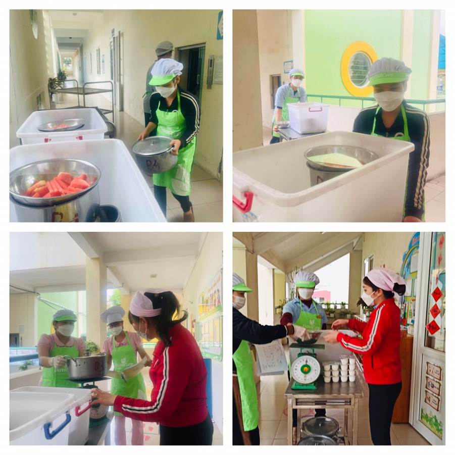 n khâu cuối cùng là chuyển thức ăn lên lớp đảm bảo đủ độ ấm, nóng để trẻ ăn đúng giờ đều được các bộ phận liên quan trong trường thực hiện thường xuyên và nghiêm túc. Sau khi thức ăn được nấu xong dựa trên sĩ số lớp và chia lượng thức ăn cho vào xoong của từng lớp và chuyển lên lớp cho trẻ ăn, đảm bảo đúng giờ. Thức