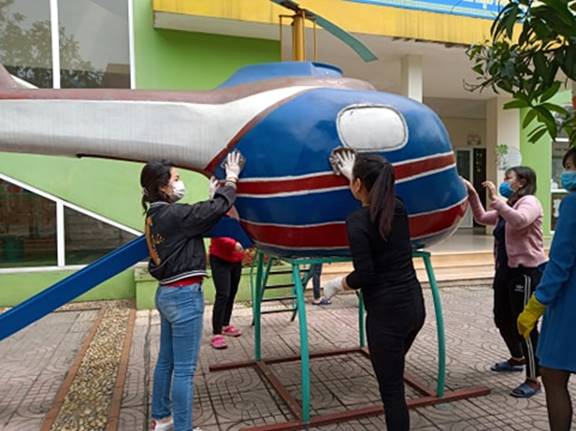 Ngoài việc vệ sinh sạch sẽ trong lớp và những đồ dùng đồ chơi của trẻ trong lớp giáo viên còn phải vệ sinh sạch sẽ tất cả các đồ chơi ngoài trời bằng nước khử khuẩn