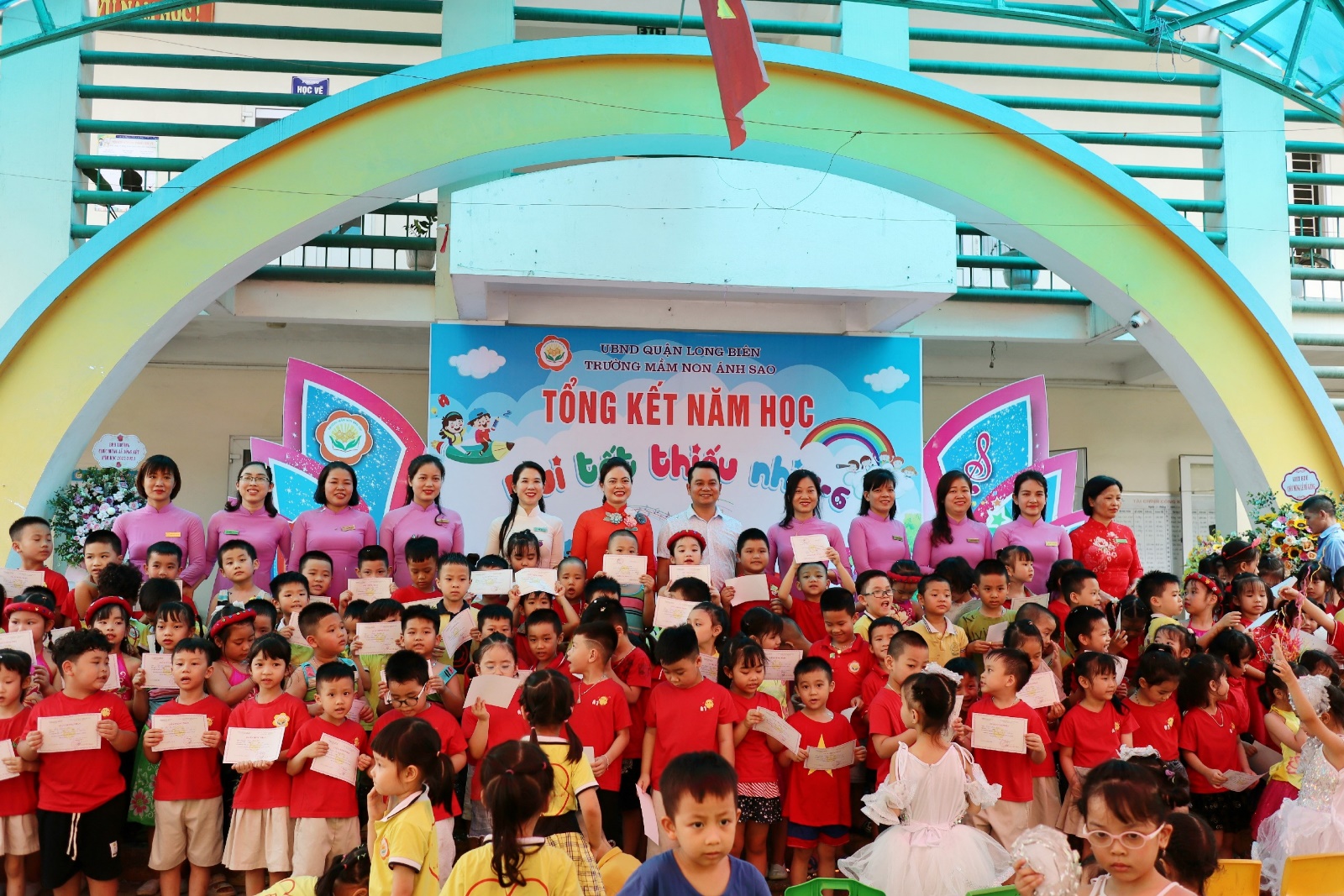 Tiếp sau là phần lễ ra trường của học sinh khối mẫu giáo lớn. Đại diện nhà trường và ban phụ huynh đã tặng giấy khen và giấy chứng nhận hoàn thành chương trình giáo dục mầm non cho 160 bé học sinh khối mẫu giáo lớn. Nhà giáo Nguyễn Thị Quyên – Bí thư chi bộ, hiệu trưởng nhà trường đã có lời phát biểu chúc các con luôn chăm ngoan học giỏi, vững bước tiến vào ngôi trường tiểu học, và luôn nhớ về mái trường mầm non Ánh Sao thân yêu.