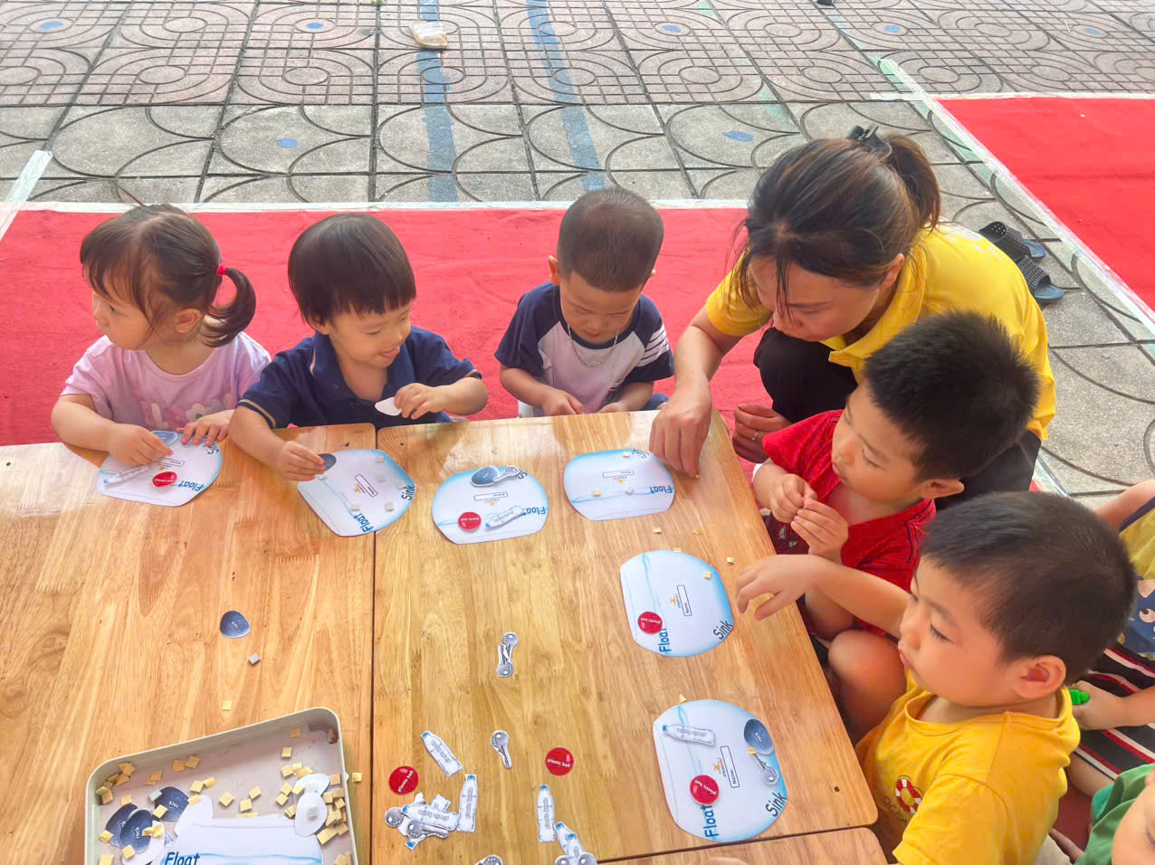 Trong hoạt động STEM về sự chìm và nổi, các bé lớp nhà trẻ D1 đã được khám phá hiện tượng vật chìm và nổi thông qua các đồ vật quen thuộc như chai nước, chìa khóa và hòn tẩy. Cô giáo chuẩn bị một chậu nước sạch, lần lượt thả từng vật vào để các bé quan sát. Khi thấy chai nước nổi, còn chìa khóa và hòn tẩy thì chìm xuống, các bé rất hào hứng và tò mò. Cô đã giải thích đơn giản rằng vật nhẹ hoặc rỗng thường nổi, còn vật nặng sẽ chìm. Hoạt động không chỉ kích thích tư duy khám phá mà còn rèn luyện khả năng quan sát, phán đoán và phát triển ngôn ngữ cho trẻ thông qua việc đặt câu hỏi và trả lời. Đây là trải nghiệm học mà chơi đầy lý thú.