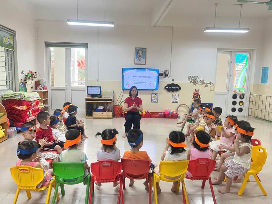 Điểm nhấn của buổi học là trò chơi "Tiết tấu vui nhộn". Dưới sự hướng dẫn của cô, các bé cùng nhau vỗ tay, lắc lư đưa bóng theo nhịp trống và âm nhạc. Những tràng cười giòn tan, những ánh mắt lấp lánh niềm vui đã làm cho không gian lớp học trở nên tràn ngập tiếng cười và sự hứng khởi.