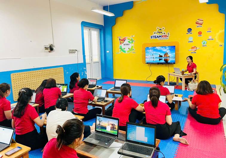 Ngày 17/4/2025, với sự hướng dẫn của đồng chí Vũ Hương Trà, 100% giáo viên trong nhà trường được chia làm 2 ca đã biết cách sử dụng phần mềm Canva để thiết kế video, bài giảng phục vụ cho công tác giảng dạy trên lớp. Sau đây là một số hình ảnh của buổi tập huấn: