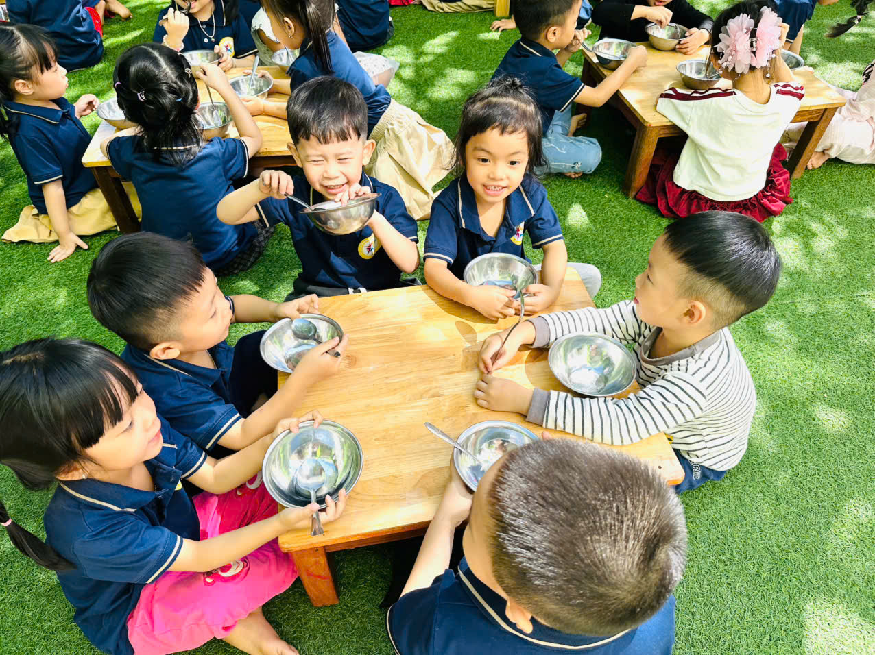 Hôm nay vui lắm ạ! Con vừa ăn ngon vừa nói chuyện rôm rả với các bạn 👧🧒💬.