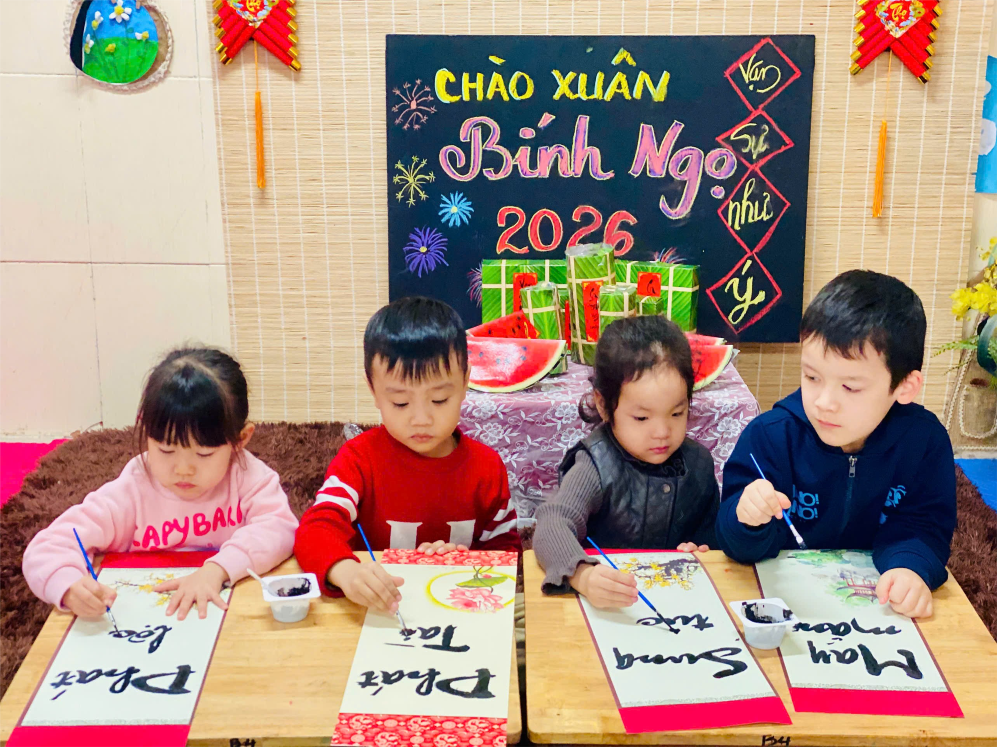 Hoạt động không chỉ mang đến niềm vui mà còn giúp các con cảm nhận được nét đẹp truyền thống của ngày Tết cổ truyền. Sau đây là một số hình ảnh của các bé khi viết thư pháp.