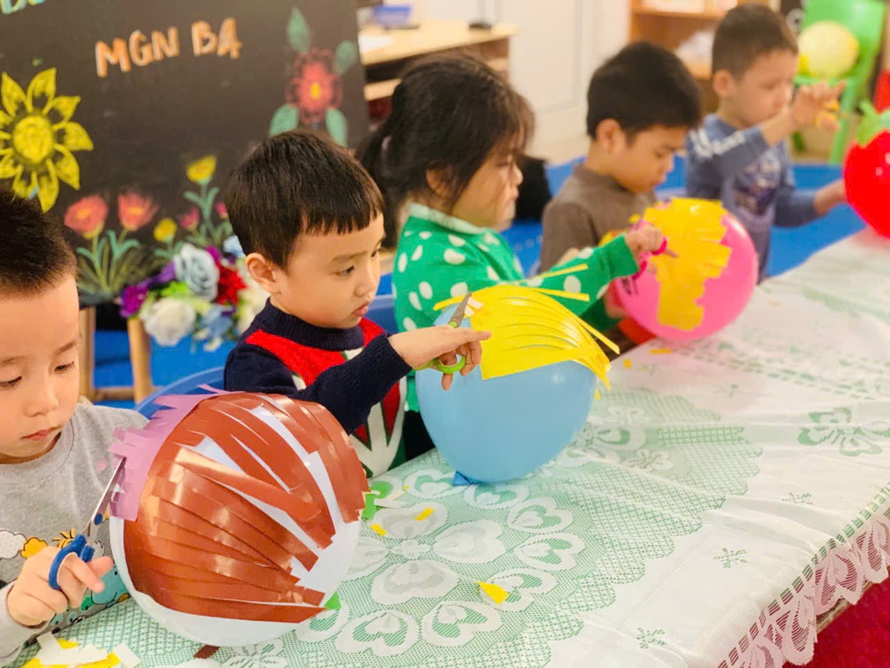 Hôm nay, các bé lớp MGN B4 cực kỳ thích thú với trải nghiệm làm thợ cắt tóc. Với những chiếc kéo nhỏ xinh và những quả bóng bay được vẽ khuôn mặt đáng yêu, gắn thêm mái tóc bằng giấy màu rực rỡ, các bàn tay bé xíu đã khéo léo tạo ra vô số kiểu tóc ngộ nghĩnh và đáng yêu. Hoạt động không chỉ mang lại tiếng cười rộn ràng mà còn giúp các con phát triển sự khéo léo và óc sáng tạo