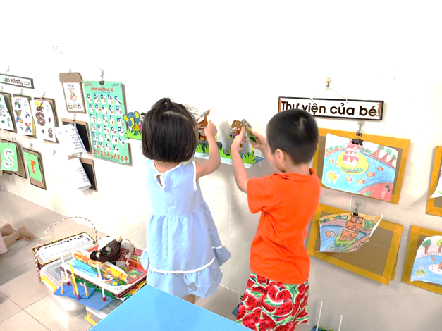 Trẻ tham gia vào các góc chơi ở lớp như: Góc bé chơi đóng vai; Góc xây dựng; Góc thư viện sách; Góc nghệ thuật; Góc khám phá trải nghiệm…Ở mỗi góc chơi trẻ đều được học những kiến thức, kỹ năng khác nhau và quan trọng hơn cả là trẻ có cơ hội được thể hiện mình và biết phối hợp cùng các bạn tham gia các hoạt động.