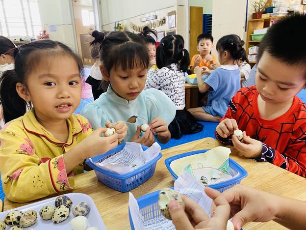 Hoạt động trải nghiệm có ý nghĩa vô cùng quan trọng, đó cũng chính là những cơ hội quý giá để trẻ làm giàu vốn kiến thức của mình từ những công việc thực tế được trẻ tự tay thực hiện. Thực hiện kế hoạch chuyên môn của lớp, cô giáo đã xây dựng hoạt động trải nghiệm “Bóc trứng chim cút” của các bạn lớp 5 tuổi.