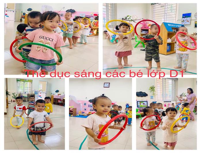 Vào mỗi buổi sáng, tất cả các bé lớp nhà trẻ D1 lại háo hức và mong chờ đến hoạt động thể dục sáng. Các bé được các cô hướng dẫn tập thể dục buổi sáng trong tiếng nhạc rộn ràng. Khi tiếng nhạc vang lên bé nào cũng nhanh nhẹn lấy vòng cầm tay xếp thành vòng tròn với sự hướng dẫn của các cô.