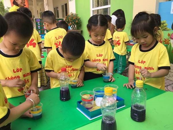 Tham gia hoạt động này, các bé được khám phá về cây bắp cải tím và sự chuyển màu của nước bắp cải tím, được chơi trò chơi bật qua 5 vòng liên tiếp rồi thả hoa. Khi chơi tự do các bé được chơi các trò chơi vận động, thổi bong bóng, chơi với cát, sỏi, câu cá, tô tượng....Đây là một trải nghiệm thú vị đối với các bé lớp mẫu giáo nhỡ B4. Liệu khi pha nước bắp cải tím với xà phòng (nước rửa tay Lifebuoy, nước cốt chanh) thì nước bắp cải tím còn nguyên màu không ? Đây là điều mà trước khi được khám phá và trải nghiệm, các con còn thắc mắc nhưng sau buổi khám phá trải nghệm này các con biết được sự đổi màu của nước bắp cải tím khi pha với những chất ở trên. Rất thú vị và tò mò phải không các bé?.....Hãy cùng hai cô giáo và các bạn lớp B4 khám phá và trải nghiệm nhé!