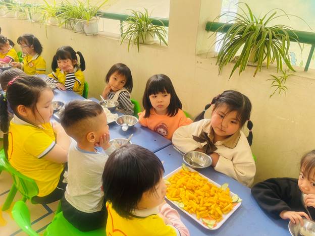 Các bé được cô giáo giới thiệu từng món ăn, hướng dẫn cách ăn uống văn minh, lịch sự như: xếp hàng chờ tới lượt lấy đồ ăn, chọn thức ăn mình thích, lấy vừa đủ, không bỏ thức ăn thừa, không làm rơi vãi thức ăn. Sau khi lấy thức ăn xong, các bé trở về chỗ ngồi của mình và thưởng thức những món ăn ngon tuyệt.