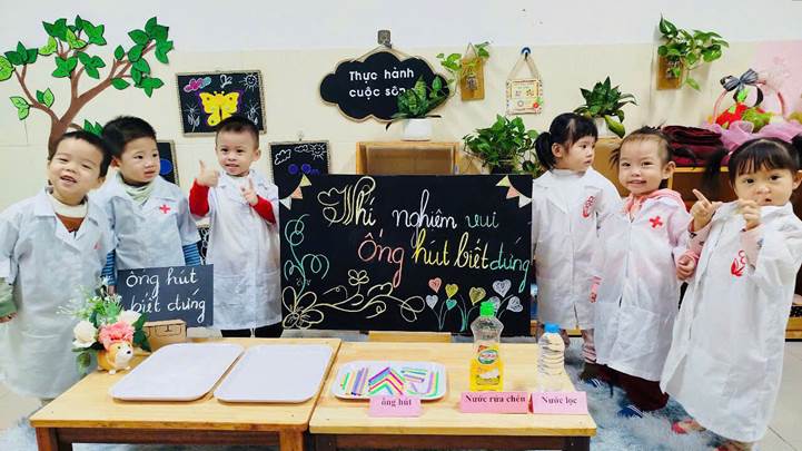 Hôm nay các bé lớp D1 cùng làm thí nghiệm vui này nhé . Với các nguyên liệu đơn giản như Ống hút, nước rửa chén, nước…, Các bạn được tự tay mình cho ống hút vào nước rửa chén một hiện tượng thật lạ ống hút có thể đứng được,các bạn quan sát một cách thích thú, các bạn tò mò khi cho ống hút vào nước không đứng được vậy tại sao khi cho vào nước dầu rửa chén có bọt thì lại đứng được?