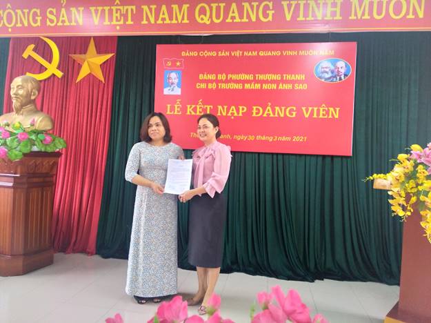 Chiều 30 tháng 3 năm 2021, Chi bộ trường Mầm non Ánh Sao tổ chức Lễ kết nạp Đảng viên cho quần chúng ưu tú Nguyễn Thị Thanh Huế.