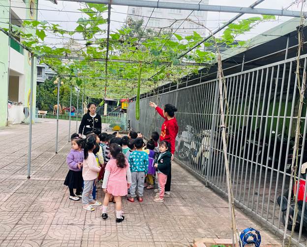 Qua nhiều ngày mưa phùn, hôm nay trời nắng nhẹ, không khí trong lành ấm áp, cô và các bạn nhỏ lớp C1 cùng nhau đi thăm vườn trường đấy. Trong khi đi dạo, chúng mình được ngắm nhìn vườn rau xanh tốt của trường. trong vườn có bao nhiêu là rau xanh đang lên mơn mởn. Dàn bầu sai lúc lỉu với những trái bầu vừa to vừa dài trông thật đẹp mắt. Rau mồng tơi, rau dền, rau lang, rau muống được trồng thành từng luống ngay ngắn thẳng hàng.