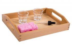 Bài học Montessori này tuy đơn giản với người lớn nhưng so với bé, đó là cả một sự rèn luyện. Trước tiên, bạn đặt khay đựng hai cái ly nhựa này xuống thảm. Đổ nước vào một ly, sau đó rót nước từ ly này sang ly trống (hoặc sử dụng công cụ hỗ trợ), lúc thực hiện bạn nói bé tập trung xem bạn làm.