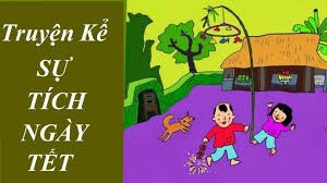 Ngày xưa, con người chưa biết tính thời gian, chưa biết tính tuổi của mình. Ở nước nọ, có một ông vua nổi tiếng thông minh và tài đức. Đất nước của ông thanh bình, dân tình no ấm. Một lần , nhân dịp vui, nhà vua nảy ý định ban thưởng cho người già nhất trong nước. Nhưng chẳng làng nào chọn được người già nhất nước. Thấy vậy, nhà vua liền phái một đoàn sứ giả đi tìm các vị thần để biết hỏi cách biết người già nhất. Vâng lệnh vua, đoàn sứ giả lên đường. Vị thần đầu tiên họ gặp là Thần Sông. Thần Sông mặc áo trắng, tóc mềm như nước, nghe sứ giả hỏi bèn lắc đầu trả lời : – Ta ở dây đã lâu nhưng chưa bằng mẹ ta. Hãy đến hỏi mẹ ta. Mẹ ta là Biển Cả. Thần Biển mặc áo xanh biếc đang ru con bằng những lời sóng vỗ. Được hỏi, thần Biển chỉ tay lên ngọn núi xa xa và nói : – Hãy hỏi Thần Núi, Thần còn sinh ra trước cả ta. Khi ta lớn lên thì Thần Núi đã già rồi. Đoàn sứ giả lại lặn lội đến gặp Thần Núi, Thần Núi da xanh rì vì rêu bám cũng lắc đầu chỉ tay lên trời : – Hãy đến hỏi Thần Mặt Trời. Lúc ta mới chào đời, ta đã phải nhắm nghiền mắt vì nắng của Thần. Thần Mặt Trời còn có trước cả ta. Làm sao đến được chổ Thần Mặt Trời. Đoàn sứ giả thất vọng quay về. Đến một khu rừng, họ gặp một bà lão nét mặt buồn rầu ngồi chăm chú trước cây hoa đào. Đoàn sứ giả đến gần hỏi: – Thưa cụ, tại sao cụ lại ngồi đây ? Bà lão trả lời : – Tôi đến đây để hái hoa đào. Thuở trước, con tôi đi xa,cây đào này đang nở hoa. Bây giờ, mỗi lần hoa đào nở, tôi lại ra hái một bông hoa để về nhớ đến con tôi. Một ý nghỉ vụt lóe lên, đoàn sứ giả xin phép bà lão trở lại kinh đô. Họ tâu lên vua việc gặp bà lão háihoa đào tính thời gian chờ con. Nhà vua vốn thông minh nên nghỉ ra cách tính tuổi con người: Cứ mỗi lần hoa đào nở thì tính một tuổi. Sau này người ta mới biết mười hai lần trăng tròn rồi khuyết, hoa đào mới nở một lần. Lại kể về chuyện nhà vua, sau khi tìm được cách tính tuổi, ông rất vui mừng, cảm động và nhớ đến bà lão hái hoa đào, nhà vua truyền cho thần dân cả nước: Mỗi lần hoa đào nở được mở hội ba ngày ba đêm. Những ngày vui ấy sau này người ta gọi là Tết. Phong tục ấy còn truyền mãi đến bây giờ.