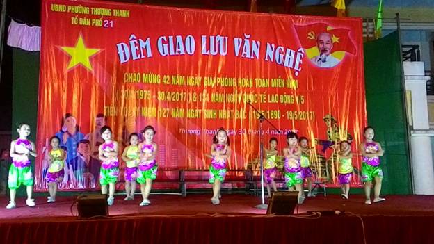 Ngày 30/4/2017 Trường mầm non Ánh Sao được tổ dân phố 21 mời tham gia đêm giao lưu văn nghệ chào mừng ngày giải phóng Miền Nam 30 – 4 và Quốc Tế lao động 1/5. Tham gia đêm giao lưu văn nghệ với tổ dân phố 21, trường mầm non Ánh Sao mang đến bài múa “Bống bống bang bang” do 14 bé đại diện cho các bé khối mẫu giáo lớn biểu diễn. Với tinh thần thoải mái, vui tươi tham gia vào đêm giao lưu văn nghệ, tiết mục biểu diễn của các bé được nhân dân ủng hộ rất nhiêt tình được thể hiện qua những tràng pháo tay ròn rã. Buổi biểu diễn văn nghệ thành công tốt đẹp với những nụ cười rạng rỡ vui tươi nở trên môi các bé. Đây cũng là một trong những kỷ niệm vui sẽ theo các bé khi mà chỉ một, hai tháng nữa thôi các con sẽ lên trường tiểu học và cũng là kỷ niệm khó quên đối với các bậc phụ huynh đã đang và luôn đồng hành cùng các con ở trường mầm non Ánh Sao thân yêu trong năm học vừa qua.