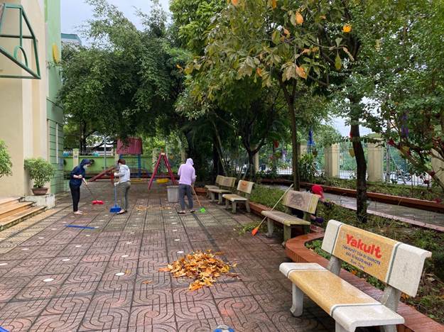 Đúng 8h sáng 100 % CBGVNV nhà trường có mặt thực hiện nghiêm túc theo lịch phân công của BGH chia thành các nhóm cắt tỉa cây, nhổ cỏ, đánh cọ rêu rều xung quanh sân trường, các khu vui chơi, Rà soát toàn bộ các chậu, bồn chức nước tránh nước ứ đọng toàn bộ sân trường, các hố ga, các thành tường.